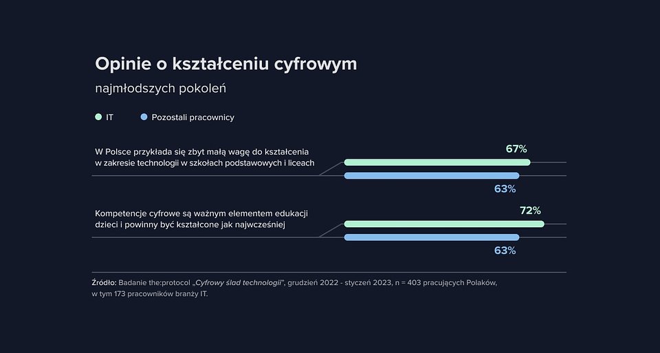 W zasadzie jako rodzice nie jesteśmy pewni poziomu dostosowania polskiego systemu edukacji do roli kształcenia w zakresie technologii. Im większa jest nasza wiedza w zakresie IT, tym mniejszym zaufaniem obdarzamy tzw. system. Niedostatki placówek edukacyjnych w tym zakresie dostrzega aż 46 proc ankietowanych, którzy mają związek z branżą technologii. Mamy przecież świadomość, że w edukacji cyfrowej nie chodzi wyłącznie o ścisłą informatykę, ale też wiedzę o potencjalnych zagrożeniach, związanych z jej nadużywaniem.