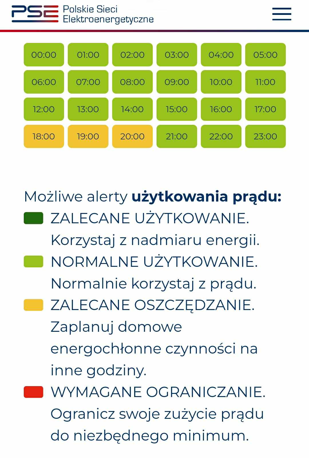 Kolor zielony oznacza „zwykłe godziny”, kiedy możemy korzystać z prądu jak zazwyczaj. Na żółto prezentowana jest sytuacja, gdy największa część energii powstanie w elektrowniach węglowych. Sugeruje się wówczas zmniejszyć zużycie prądu. Najczęściej są to godziny wieczorne. W aplikacji jeszcze może pojawić się kolor czerwony, który odnosi się do sytuacji wyjątkowej, kiedy nie ma wystarczającej rezerwy mocy i każdy kilowat mniej ma ogromne znaczenie dla bezpieczeństwa pracy systemu.