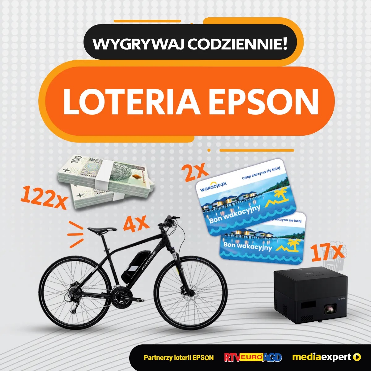 Pełnoletni klienci Epsona, którzy do końca grudnia dokonają zakupu objętego promocją produktu producenta (z wyłączeniem papierów i materiałów eksploatacyjnych) będą mieli szansę zdobyć atrakcyjne nagrody. Do wygrania są bony na usługi turystyczne z portalu wakacje.pl o wartości 40 000 złotych (2 nagrody główne), rowery elektryczne Kross Evado Hybrid 1.0 o wartości 4 800 zł (nagroda miesięczna), projektory Epson EF-12 o wartości 4 300 zł (nagroda tygodniowa), nagrody pieniężne o wartości 1 000 zł brutto (nagroda dzienna).