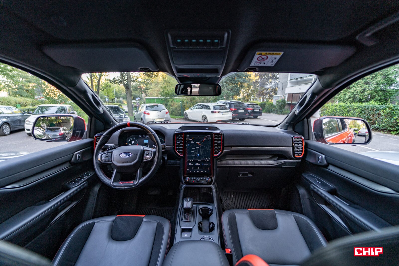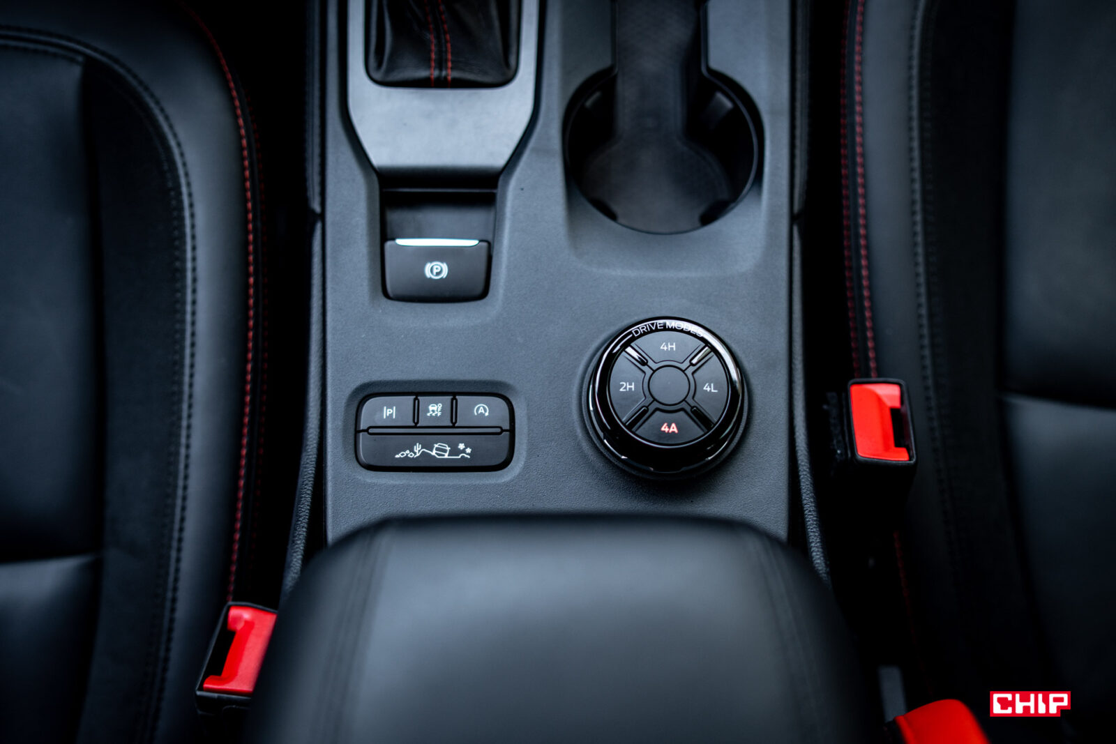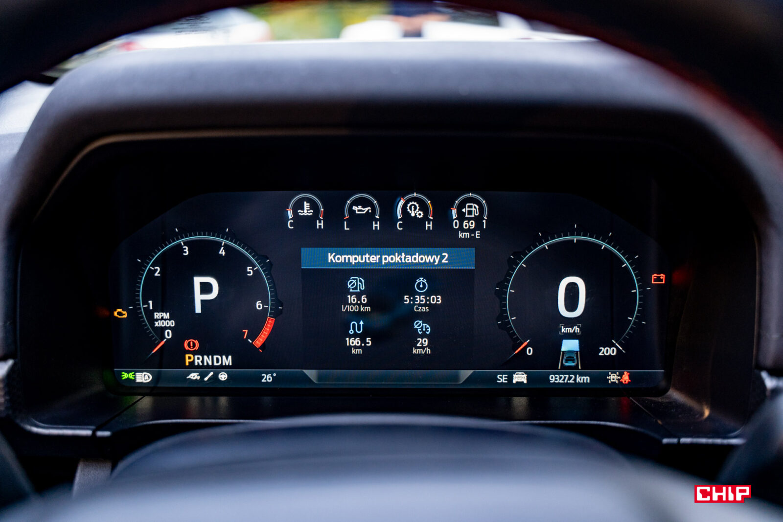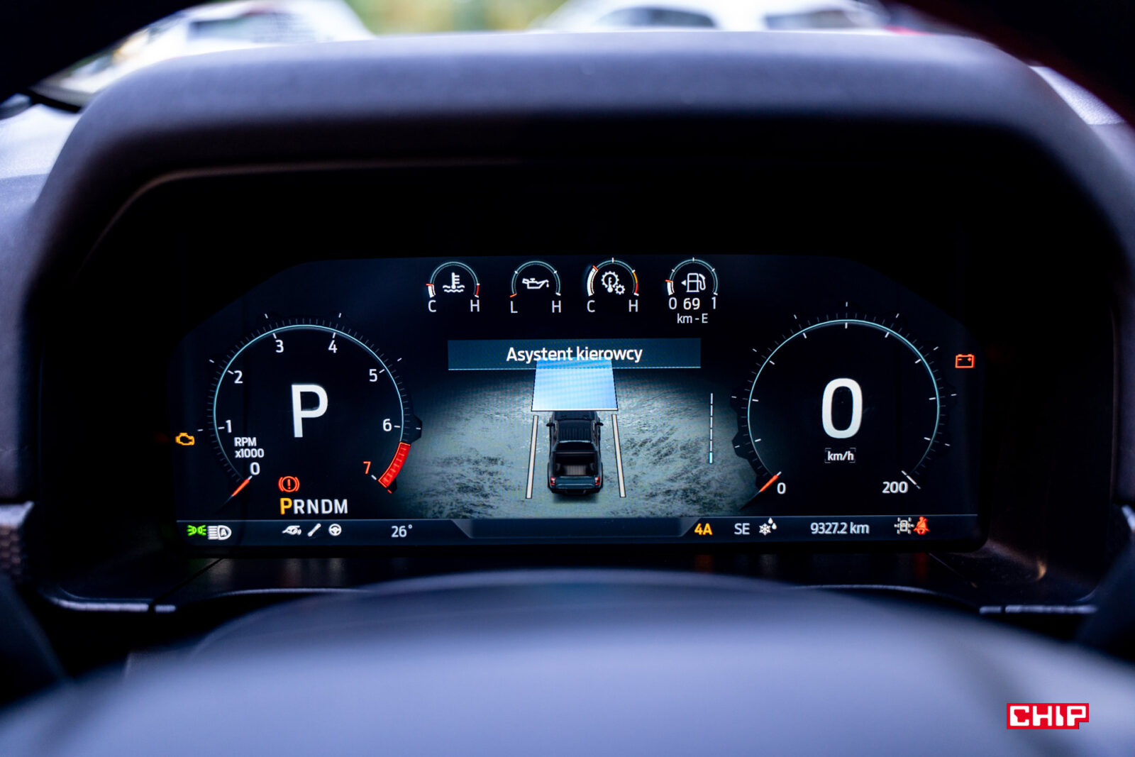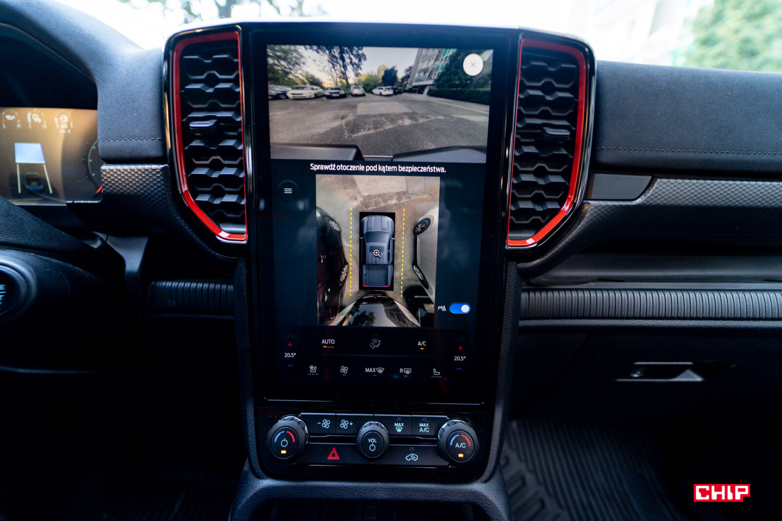 Ekran jest świetnej jakości, a umieszczenie go bardzo pionowo skutecznie niweluje odblaski. Czy tak duży wyświetlacz jest potrzebny? To kwestia gustu. Ford zadbał o to, aby większością funkcji dało się sterować przyciskami. I tak mamy duże pokrętło wyboru trybów jazdy, czy przyciski sterujące napędem. Za to ekran świetnie nadaje się do poglądu obrazu z kamer, co jest szczególnie przydatne w terenie. A kamery 360 stopni mamy w standardzie. W niektórych trybach domyślnie aktywuje się obraz z kamery, ale tu uspokajam, jeśli ktoś podchodzi do jazdy terenowej ortodoksyjnie, podgląd obrazu można wyłączyć jednym dotknięciem ekranu.