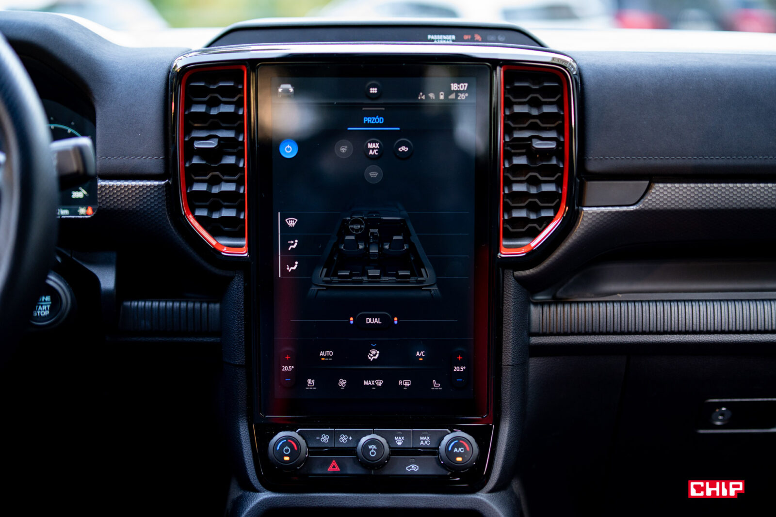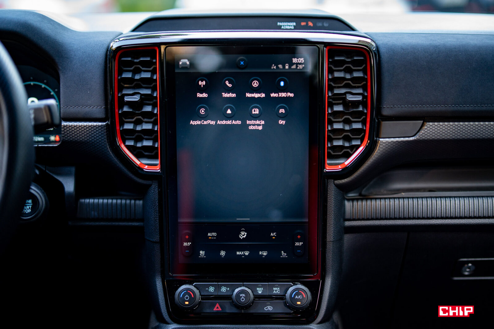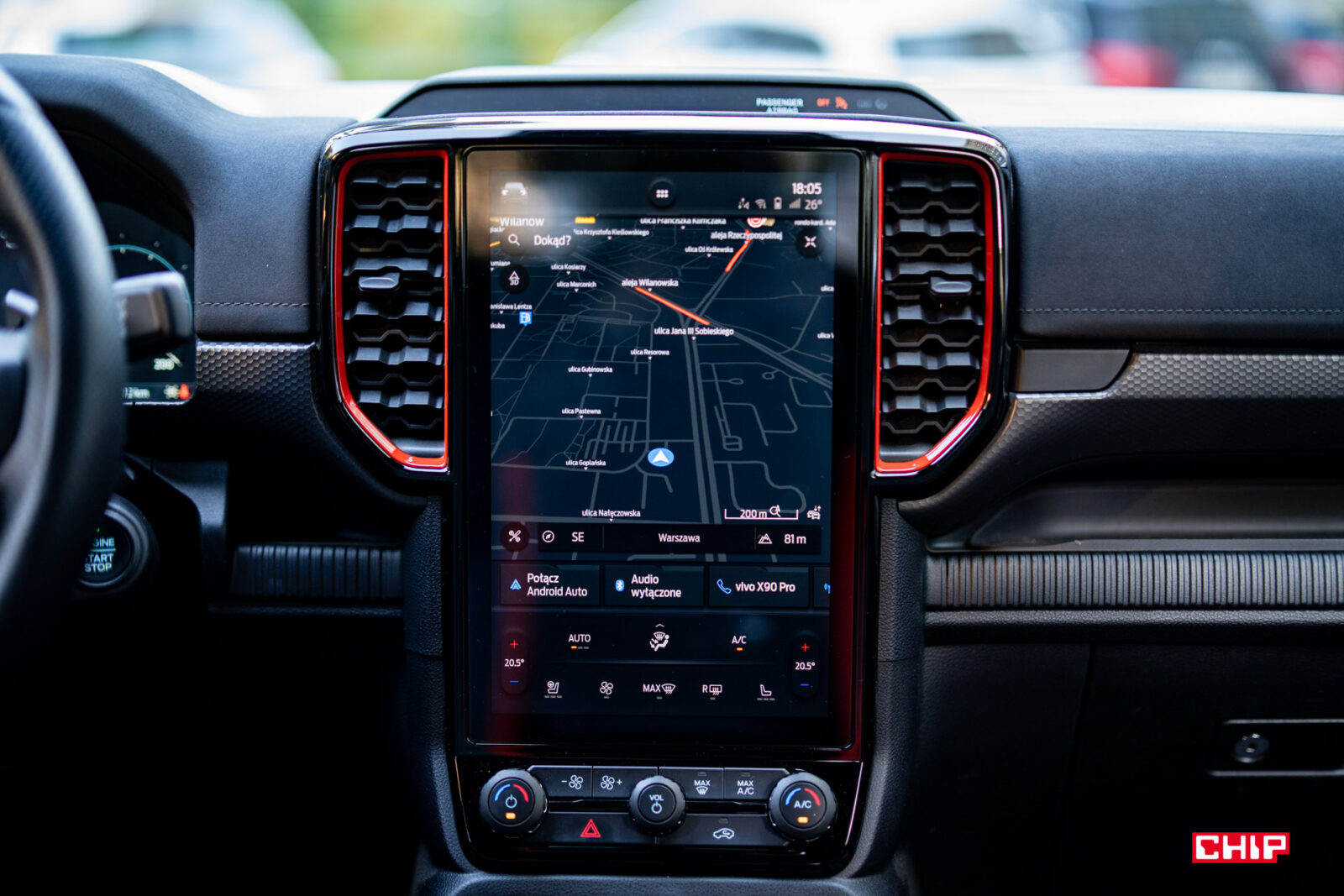 Ford wyposażył Rangera Raptora w ogromny, pionowy ekran. Znany choćby z Mustanga Mach-E. Ma ona w zasadzie taką samą funkcjonalność, czyli w górnej części mamy interfejs lub Android Auto/Apple CarPlay (oba bezprzewodowo), w dolnej na stałe wyświetlone informacje o klimatyzacji. Klimatyzacją sterujemy głównie za pomocą przycisków, co jest bardzo dobrym zabiegiem. Ogółem interfejs jest rozbudowany, ale prosty w obsłudze.