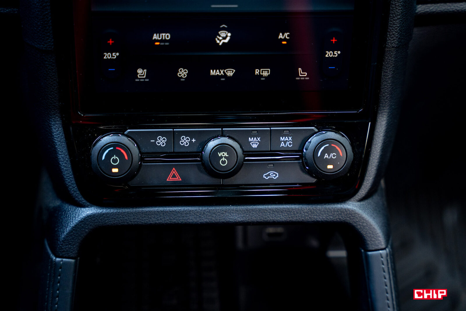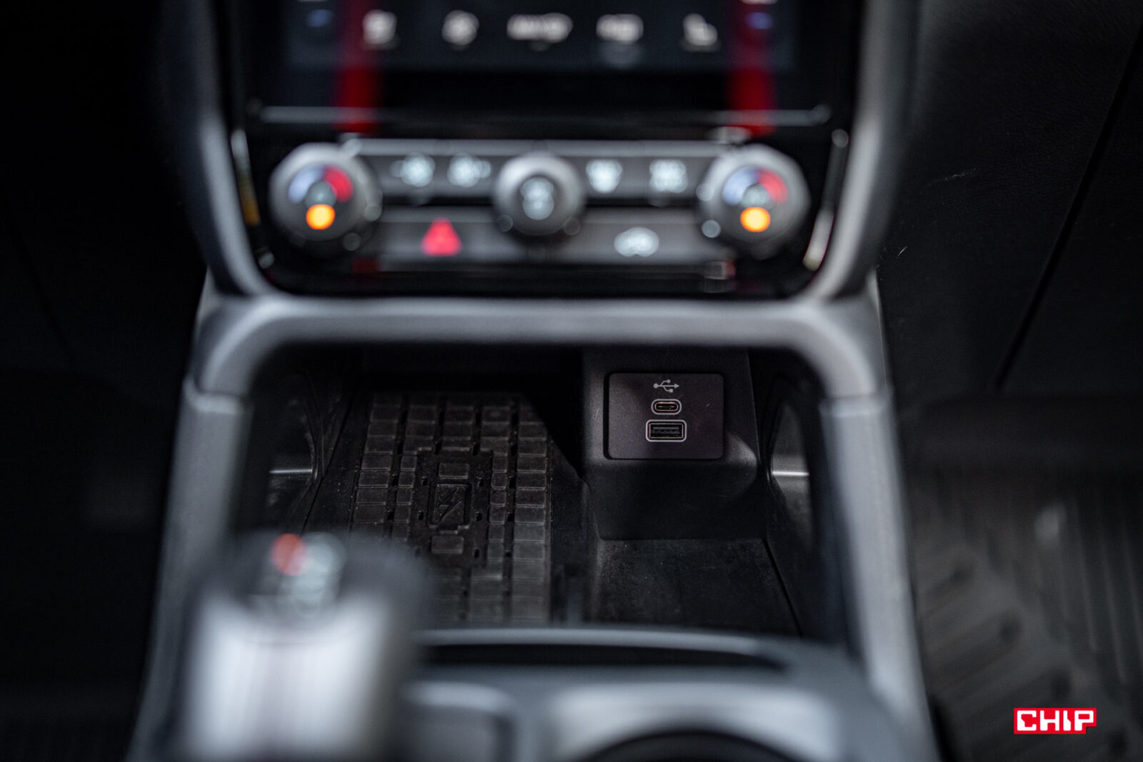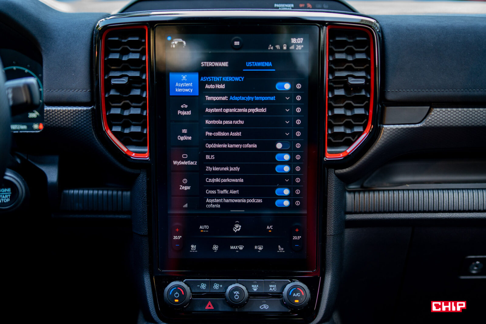 Ford wyposażył Rangera Raptora w ogromny, pionowy ekran. Znany choćby z Mustanga Mach-E. Ma ona w zasadzie taką samą funkcjonalność, czyli w górnej części mamy interfejs lub Android Auto/Apple CarPlay (oba bezprzewodowo), w dolnej na stałe wyświetlone informacje o klimatyzacji. Klimatyzacją sterujemy głównie za pomocą przycisków, co jest bardzo dobrym zabiegiem. Ogółem interfejs jest rozbudowany, ale prosty w obsłudze.
