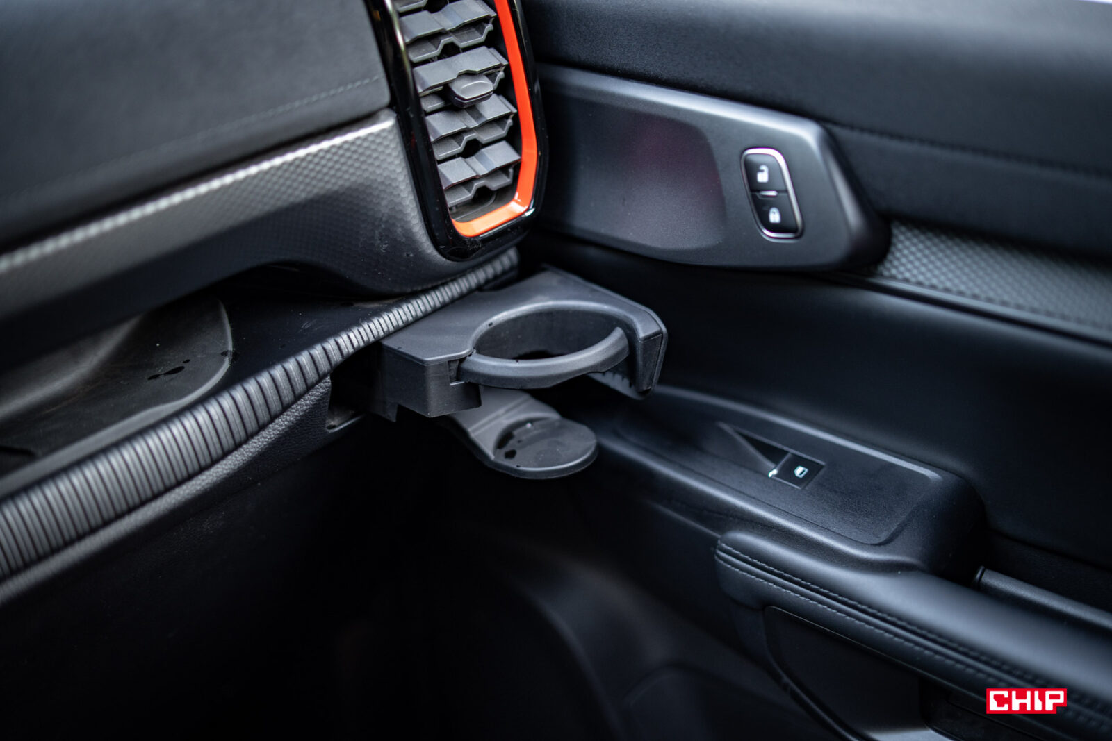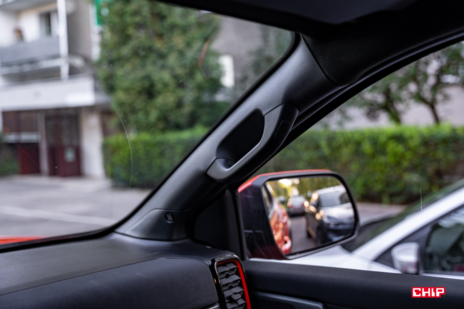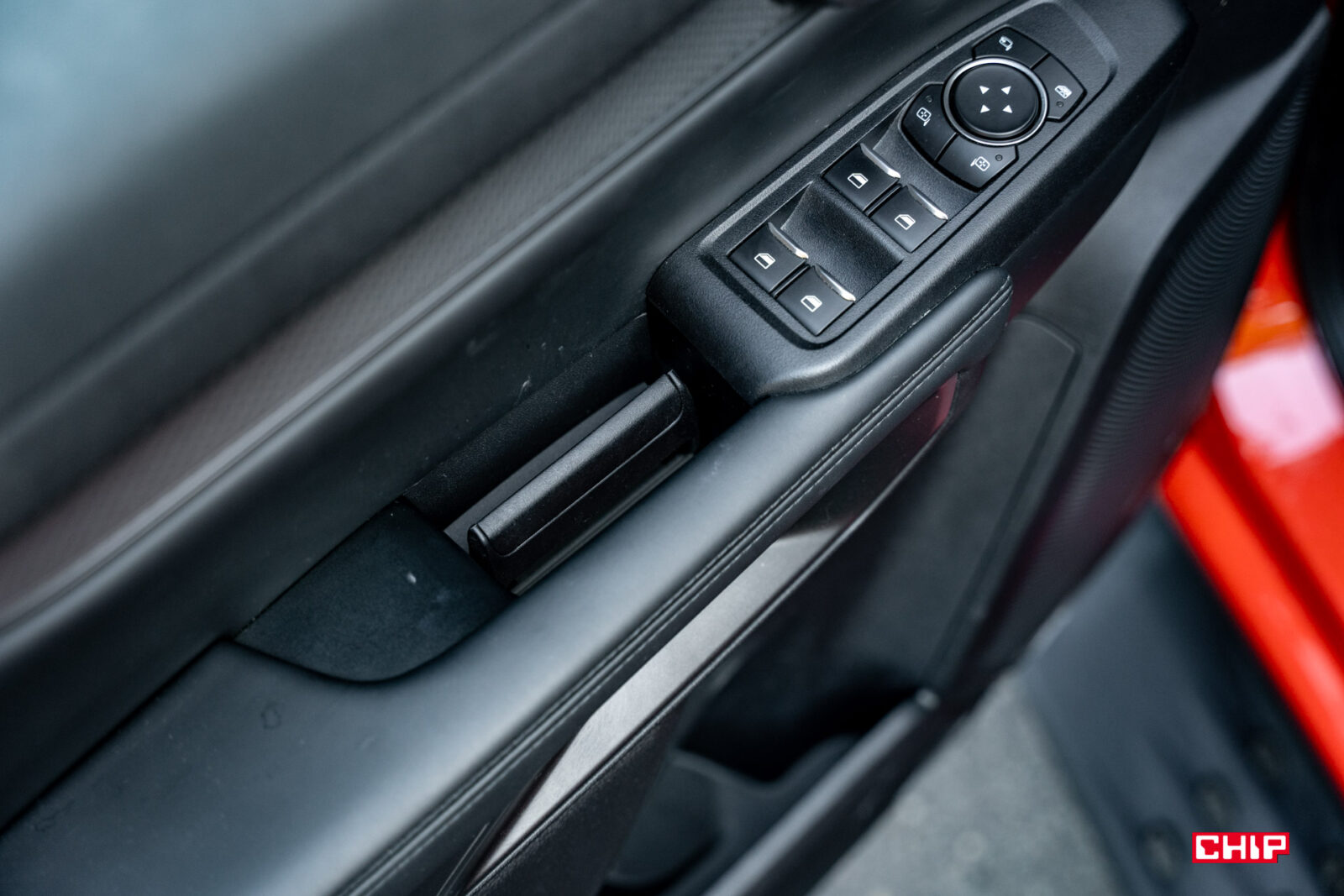 Ciekawym elementem, o którym warto wspomnieć, są klamki od wewnątrz. Są umieszczone na uchwytach, za które zazwyczaj łapiemy podczas wysiadania. Początkowo miałem mieszane uczucia, bo co jeśli np. w trakcie jazdy w terenie pasażer odruchowo chwyci się czegokolwiek, przypadkiem złapie klamkę i otworzy drzwi? Z drugiej strony, w dwóch kolejnych testowych autach szukałem klamki właśnie w tym samym miejscu co w Fordzie i wygląda na to, że to chyba najbardziej intuicyjne umieszczenie, jakie można sobie wyobrazić.