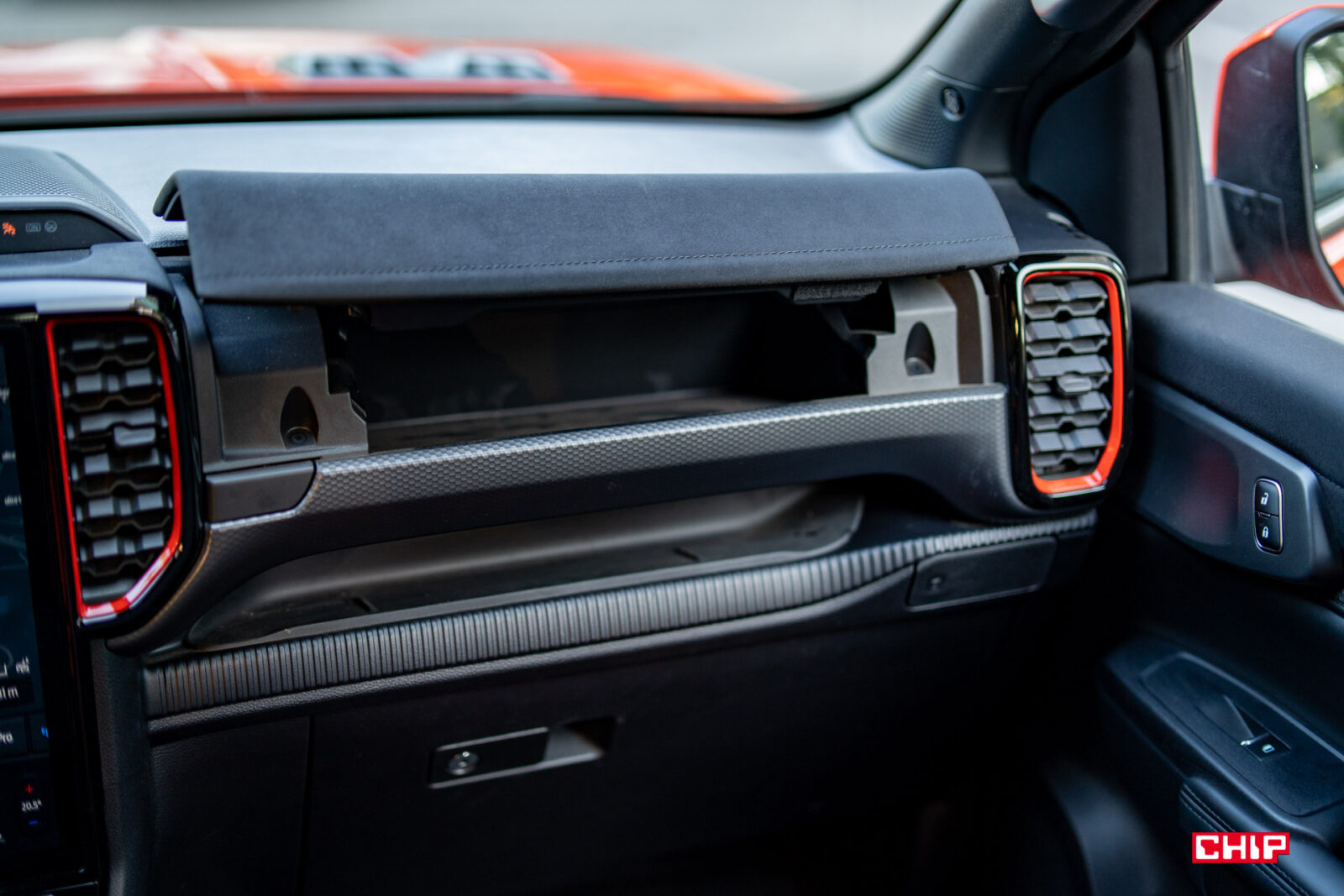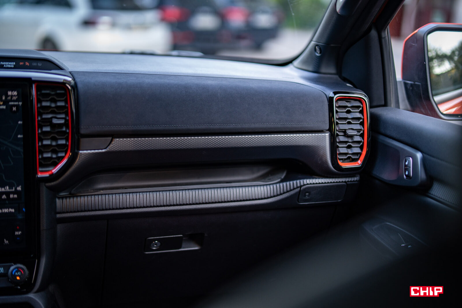 Jak przystało na amerykański samochód, wnętrze Rangera Raptora jest do bólu funkcjonalne. Duży podłokietnik, uchwyt na napoje plus dodatkowy uchwyt przed fotelem pasażera, wysuwany z deski rozdzielczej. Przyznam się, że początkowo odkryłem go zupełnie przypadkiem po tym, jak trąciłem go kolanem podczas wsiadania. Tak, wsiadanie do Raptora jest sztuką, którą trzeba opanować i podpowiem, że ten wielki dodatkowy próg to nie jest tylko ozdoba. Podobnie jak wielkie uchwyty na przednich słupkach. Warto z nich korzystać.
