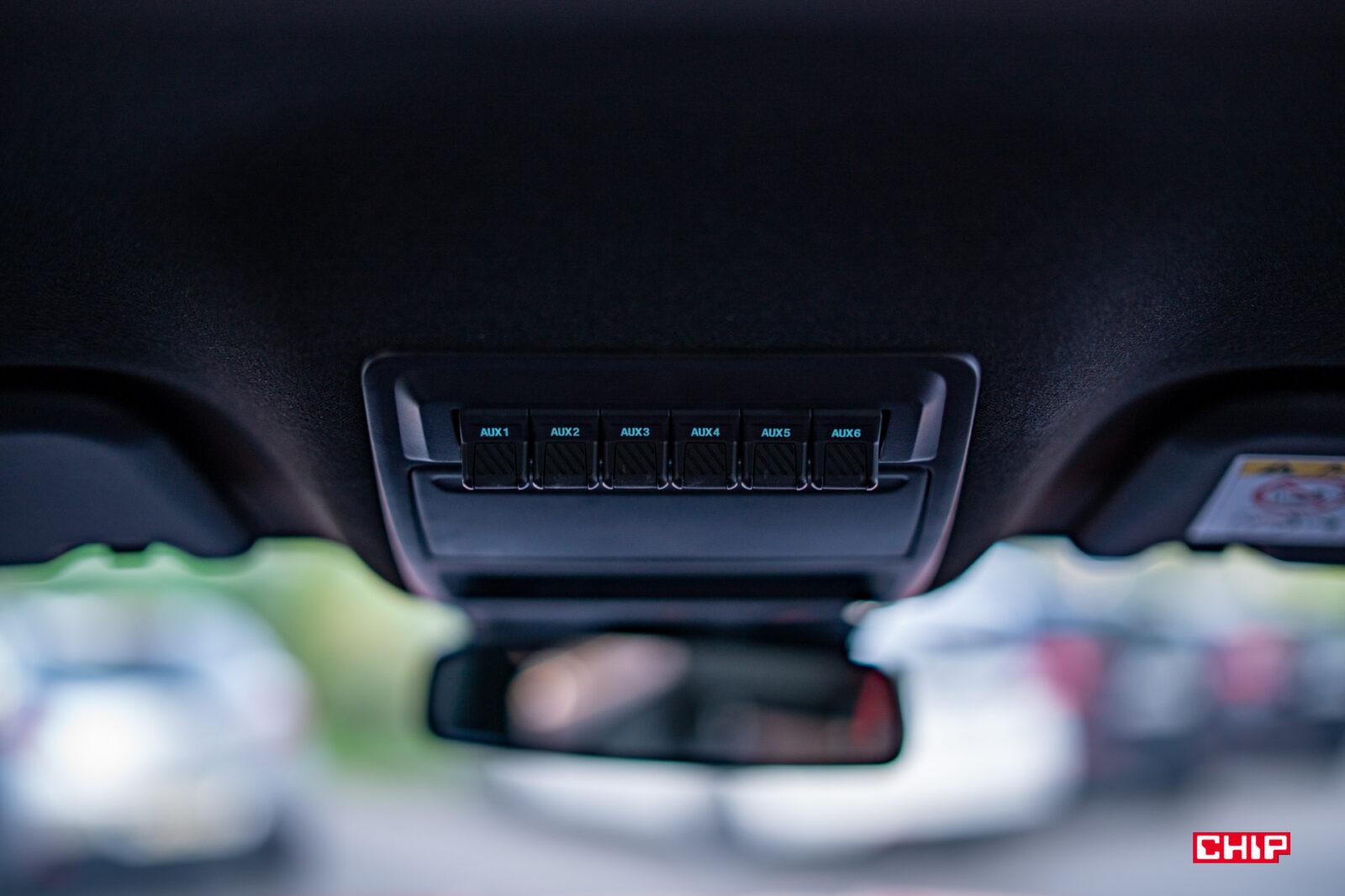 Niektórych może zastanawiać, po co na suficie Raptora umieszczono aż sześć przycisków rodem z myśliwca? Można je nazwać skrótami i są dostępne w standardowym wyposażeniu. Jeśli będziecie chcieli podłączyć tu dodatkowe akcesoria, np. wyciągarkę czy oświetlenie, sterowanie nimi można przypisać do tych właśnie przełączników.