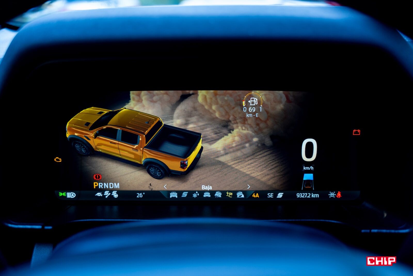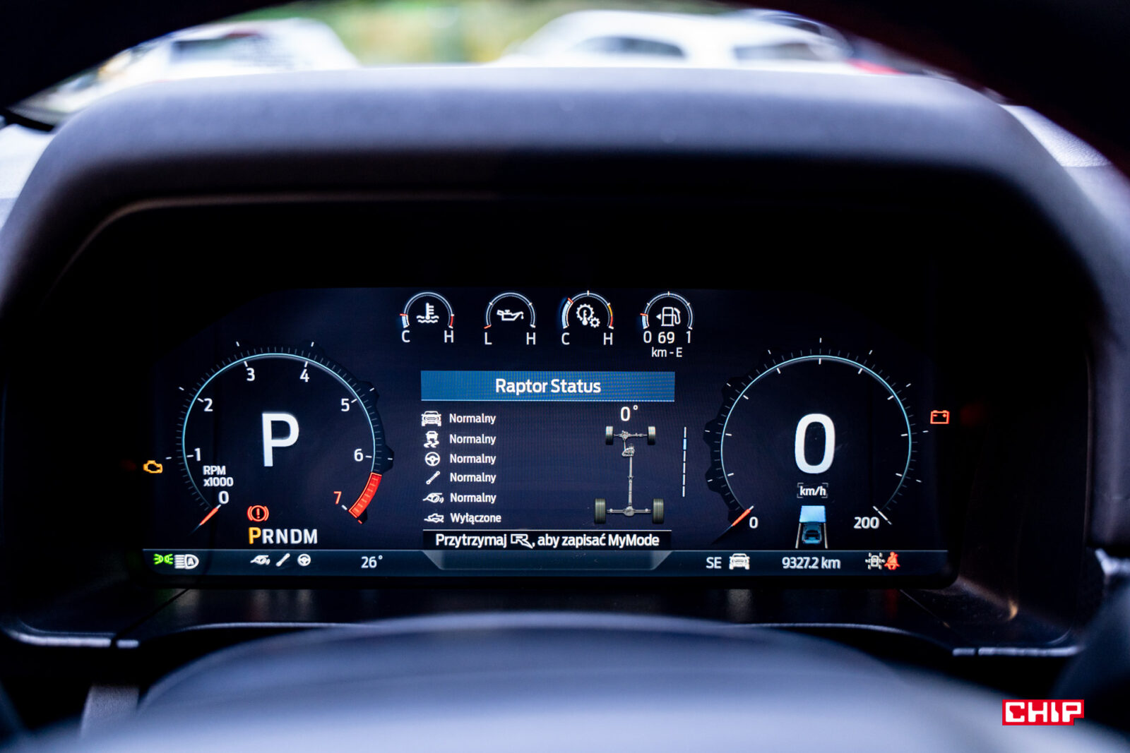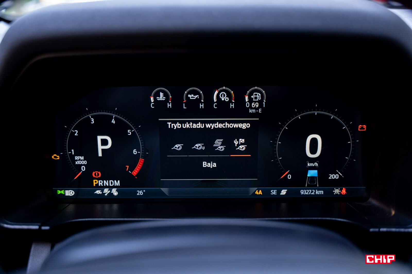 Ponieważ mamy tutaj do czynienia z dużym (jak na europejskie normy) silnikiem, producent zadbał też o jego odpowiednie brzmienie. Mamy tutaj elektronicznie sterowany wydech o czterech trybach pracy: Cichy, Normalny, Sport i Baja, macie więc spore pole do popisu. Jeżeli nie chcecie nadmiernie zwracać na siebie uwagi (powodzenia), możecie wybrać tryb cichy lub normalny. Raptor będzie pracował kulturalnie, bez zbędnego wycia i hałasu. Jeżeli wręcz przeciwnie – chcecie, żeby otoczenie usłyszało Was, zanim Was zobaczy, do Waszej dyspozycji jest tryb Sport, który skutecznie spełni to zadanie, natomiast jeśli korzystacie z jednego z trybów terenowych i ponad odgłosy przyrody umiłowaliście dźwięk silnika, pozostaje tryb Baja. Będziecie nie tylko imponująco przedzierać się przez teren na co dzień zarezerwowany wyłącznie dla ciągników, będziecie przy tym epicko brzmieć. Udało mi się przyciągnąć w ten sposób uwagę pokaźnego stadka krów, nie chwaląc się. Ich miny były pełne podziwu.