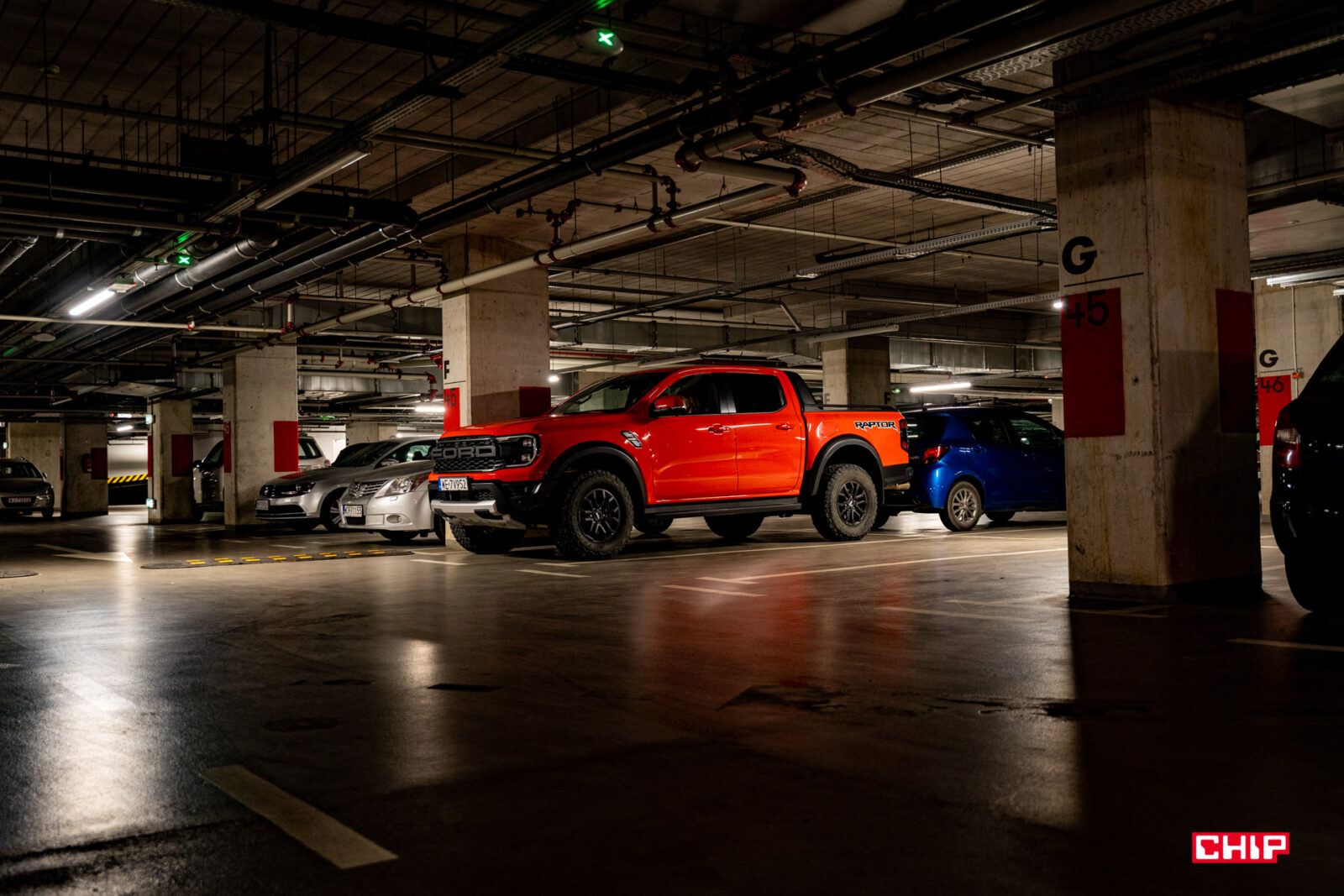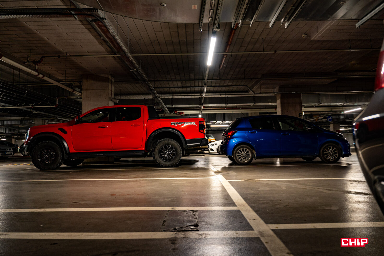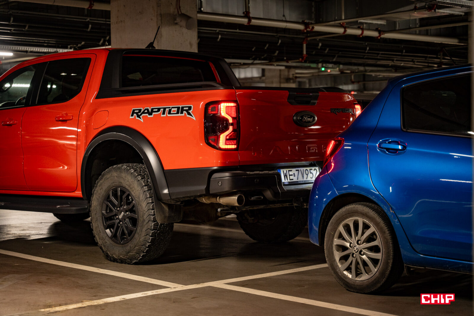 A żeby lepiej zobrazować Wam ogromne wymiary Raptora, tak prezentuje się w parkingu podziemnym galerii handlowej. Toyota Yaris dla skali. Teraz rozumiecie, co mam na myśli?