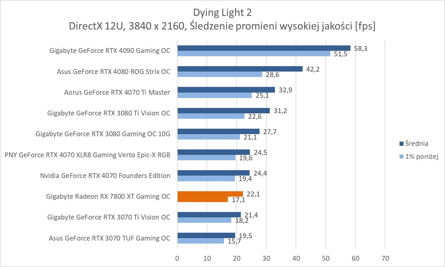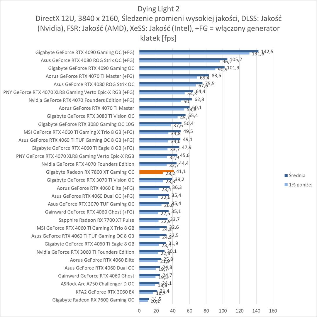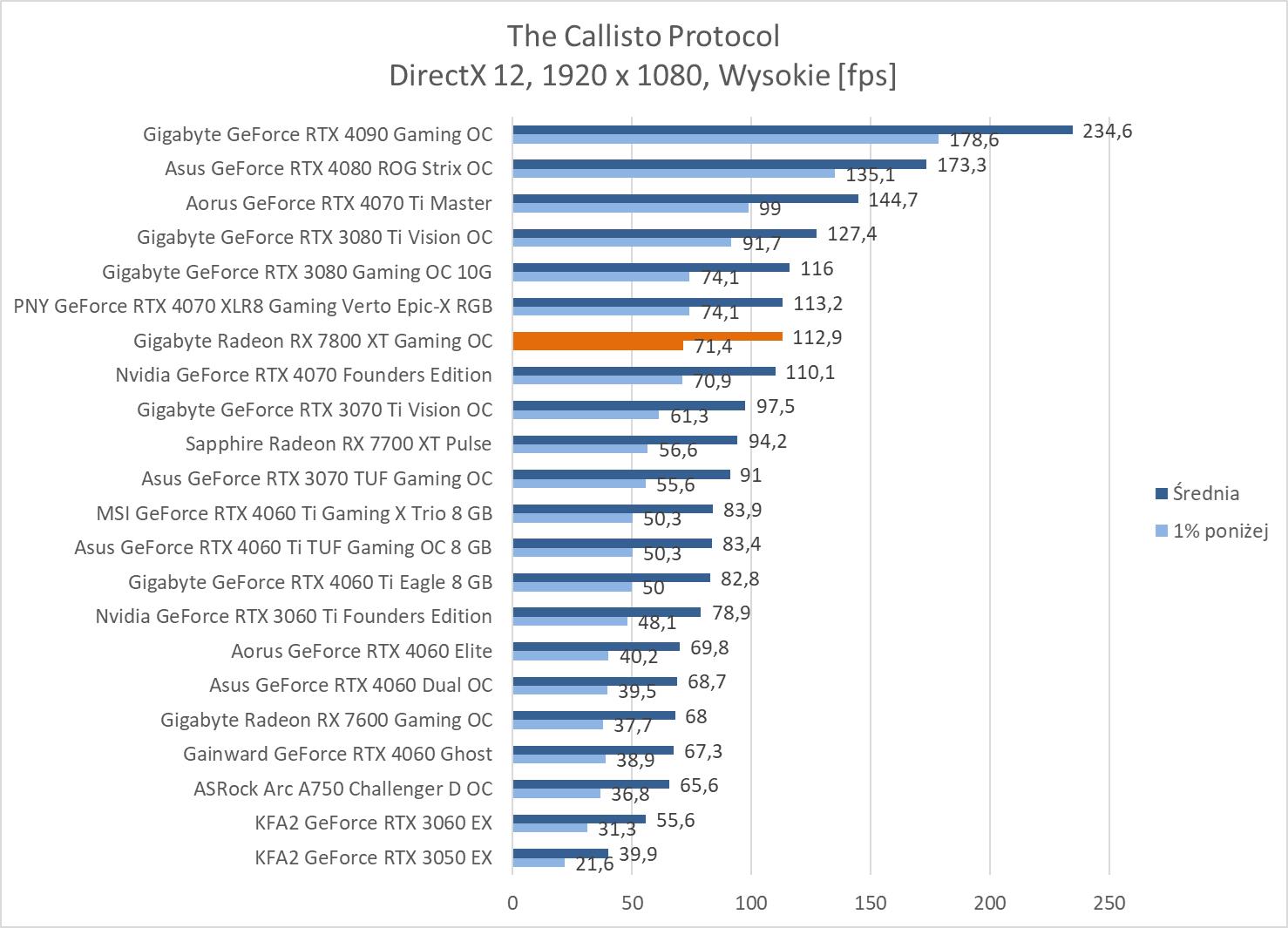 Przy ray tracingu mamy fatalne wyniki w Hogwarts Legacy, ale tam również 7700 XT wypada słabo. W 3 grach mamy też powyżej 60 fps, więc spokojnie można grać. Wyniki oprócz The Callisto Protocol pokazują, że karta jest jednak słabsza od RTX 4070.