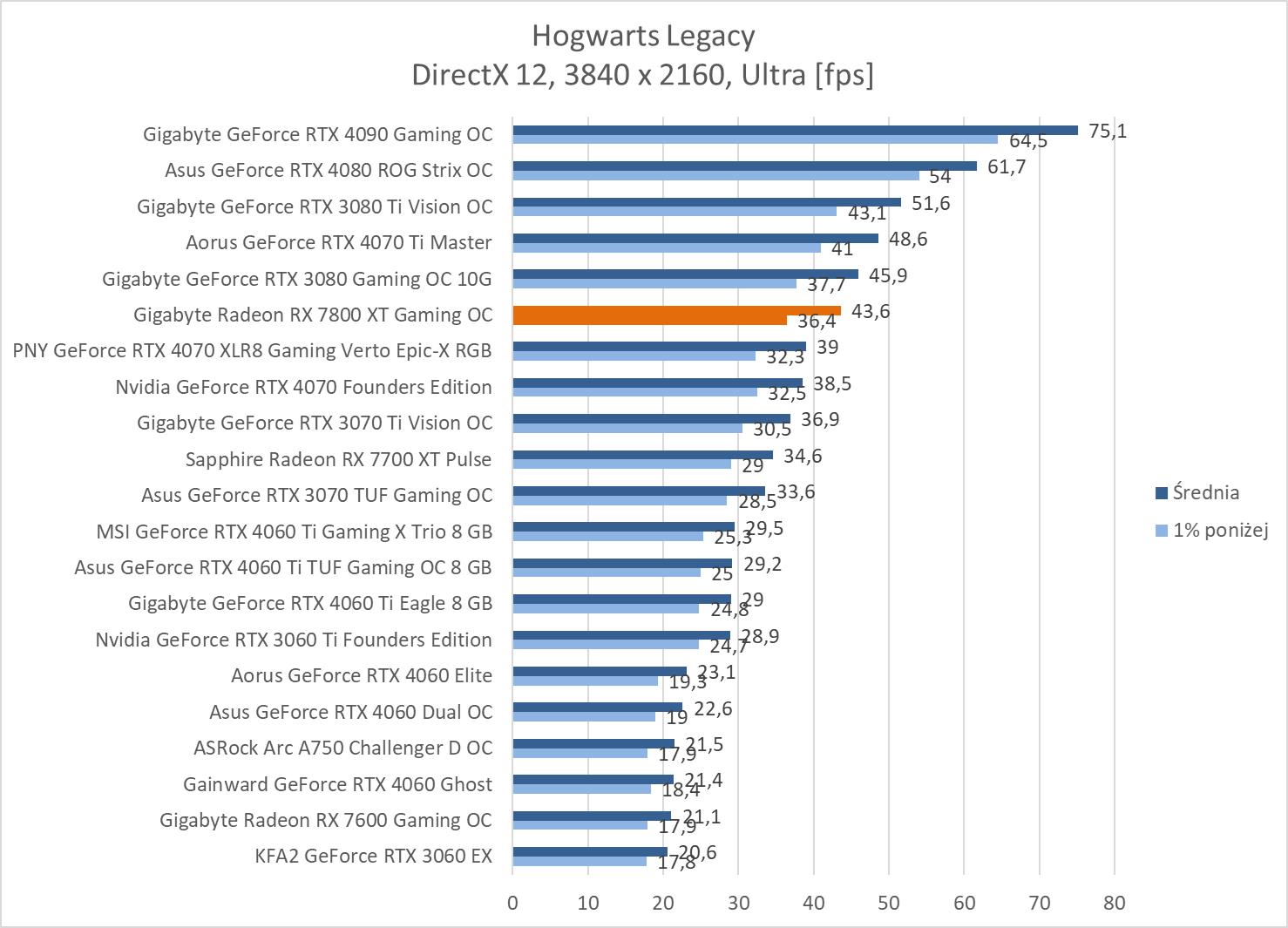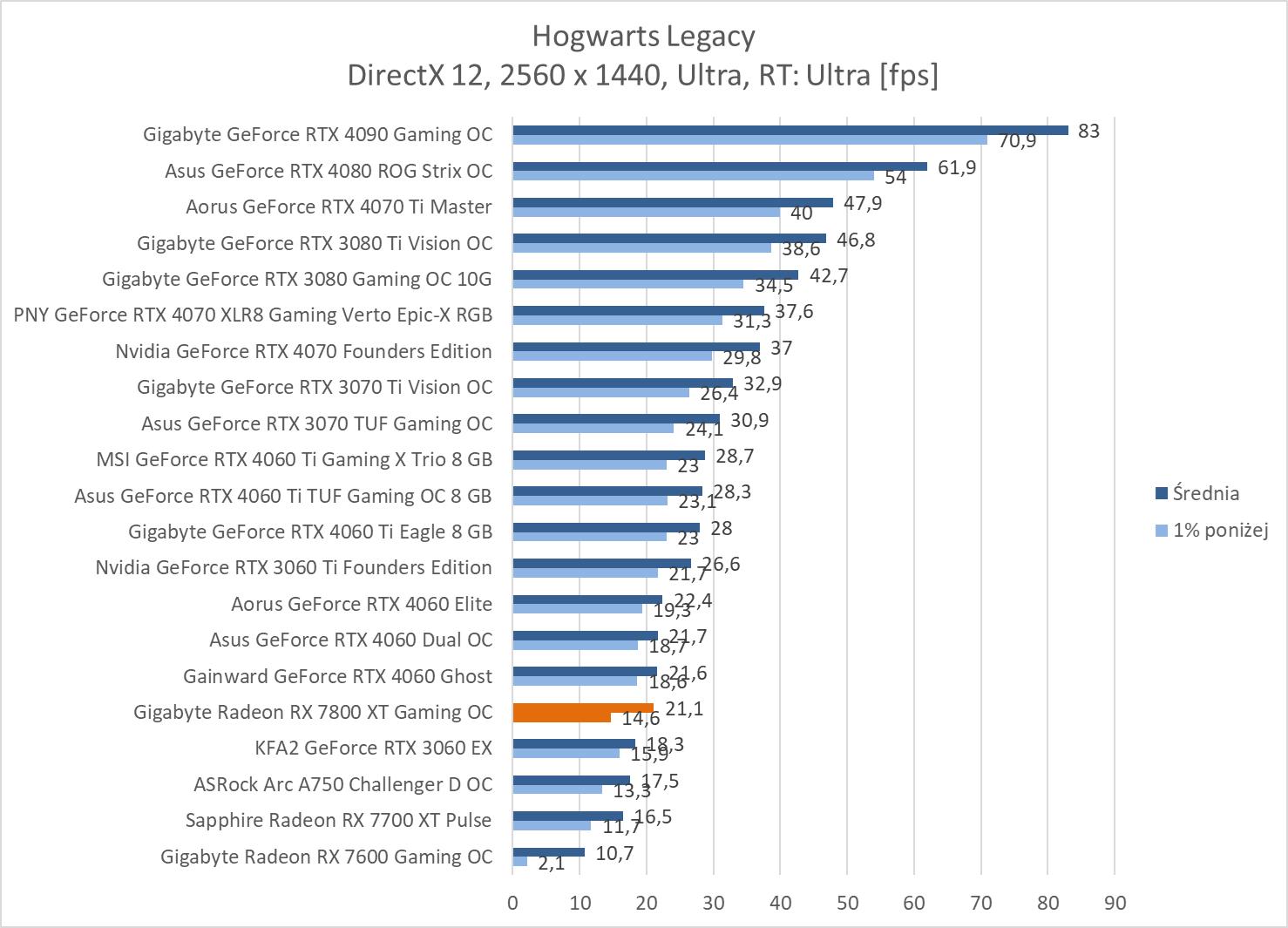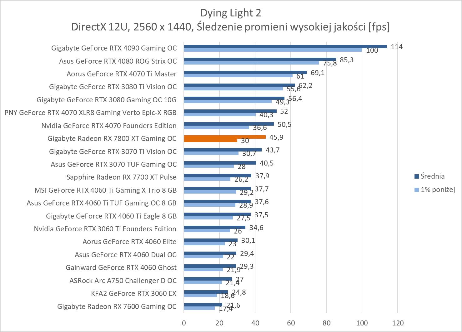 Przy ray tracingu mamy fatalne wyniki w Hogwarts Legacy, ale tam również 7700 XT wypada słabo. W 3 grach mamy też powyżej 60 fps, więc spokojnie można grać. Wyniki oprócz The Callisto Protocol pokazują, że karta jest jednak słabsza od RTX 4070.