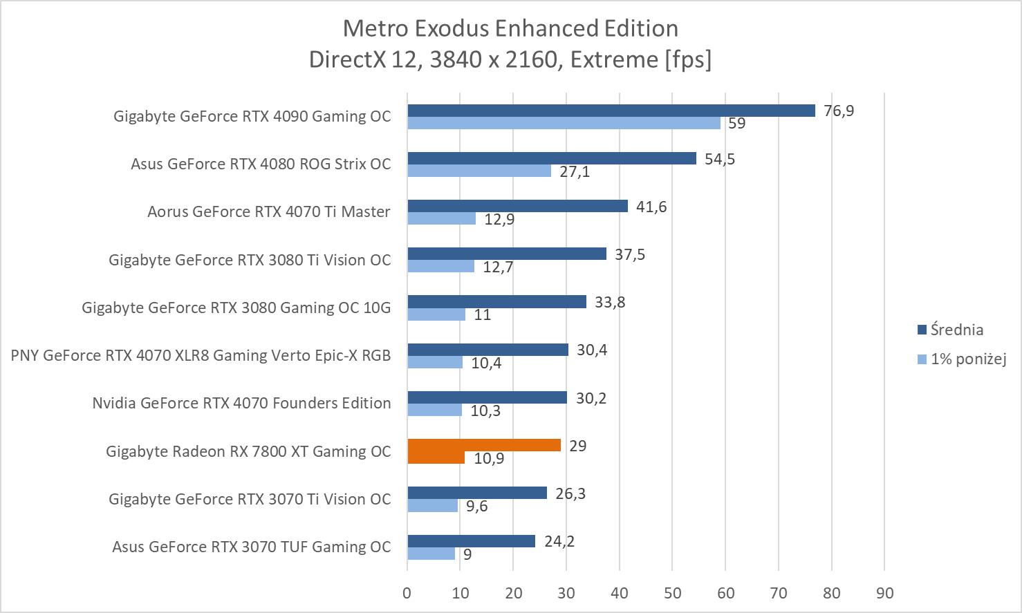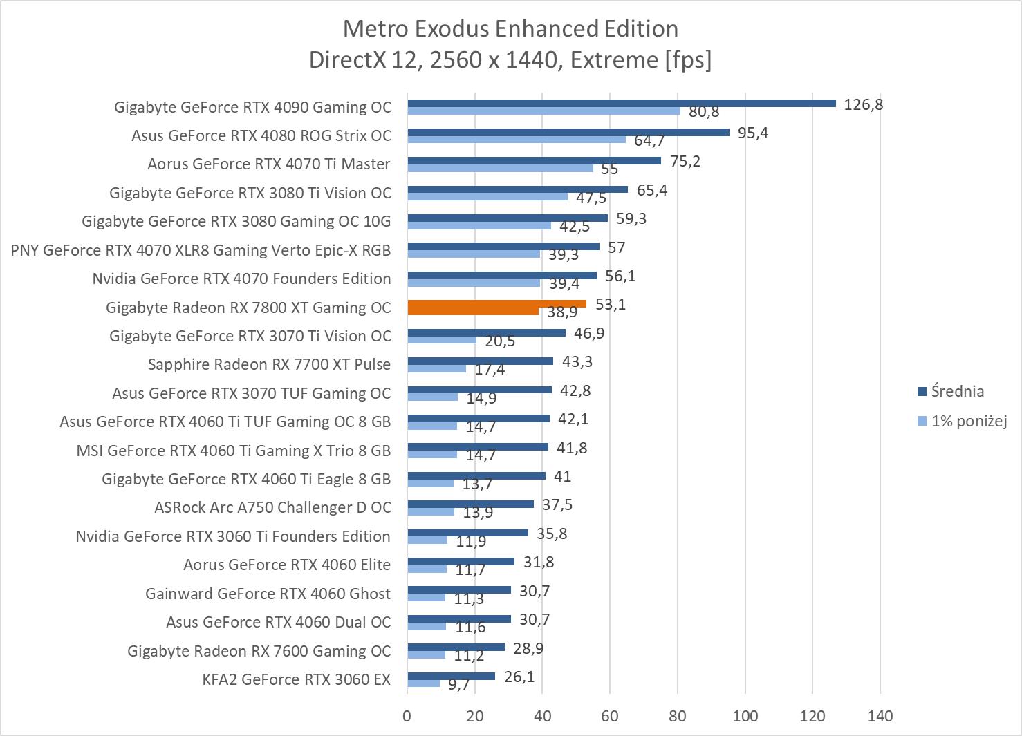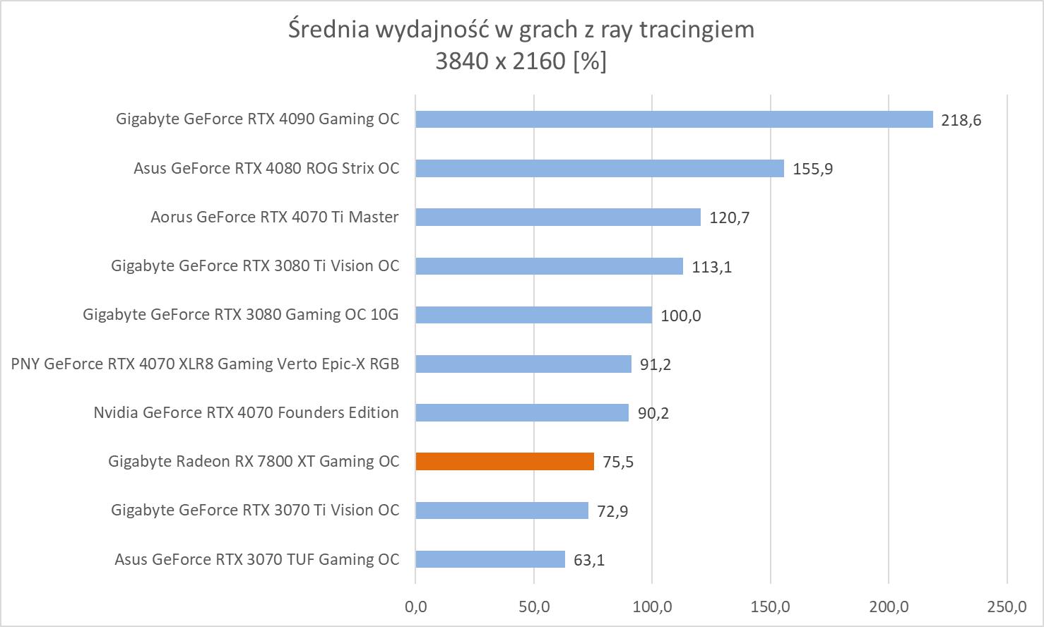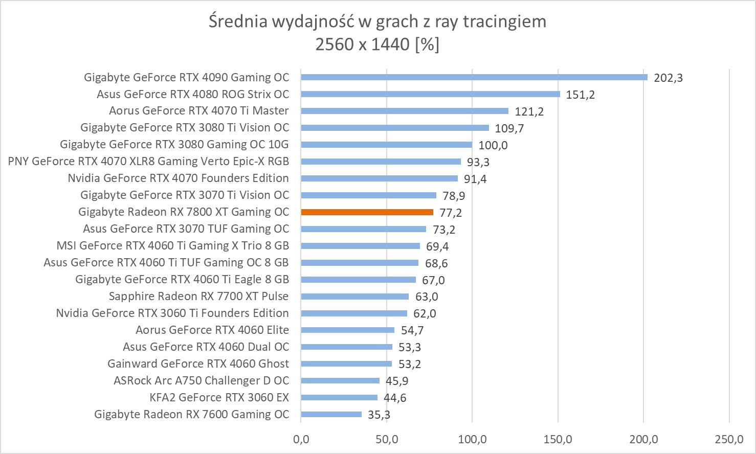 Testowany model ma przewagę nad RTX 4070 Founders Edition w każdej z rozdzielczości. Przewaga ta rośnie wraz z rozdzielczościami i wynosi kolejno ok. 6,5%, 11,2% oraz 13,2%. Nie są to spore różnice, ale z pewnością występują. Szkoda tutaj, że nie mam na wykresach RX 6800 XT bo ciekawe, jaki postęp tutaj jest widoczny. Natomiast w rasteryzacji, w szczególności w wyższych rozdzielczościach karta jest trochę wydajniejsza od RTX 4070 i plasuje się w okolicach RTX 3080.