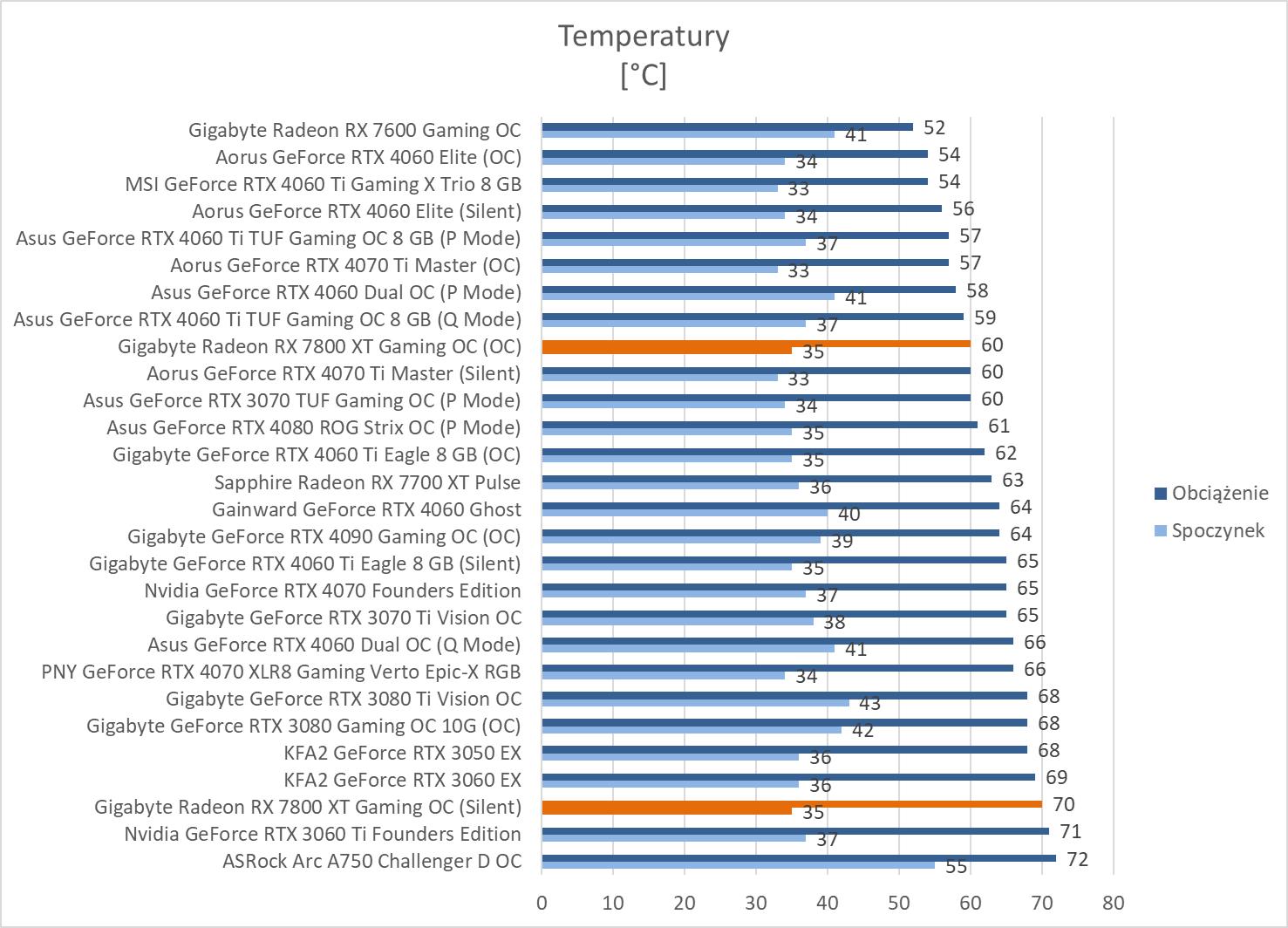 Gigabyte Radeon RX 7800 XT Gaming OC ma podwójny BIOS i różnice w temperaturach pod obciążeniem są naprawdę spore. Tutaj przy OC jest chłodno, a przy Silent karta znajduje się po drugiej stronie wykresu.