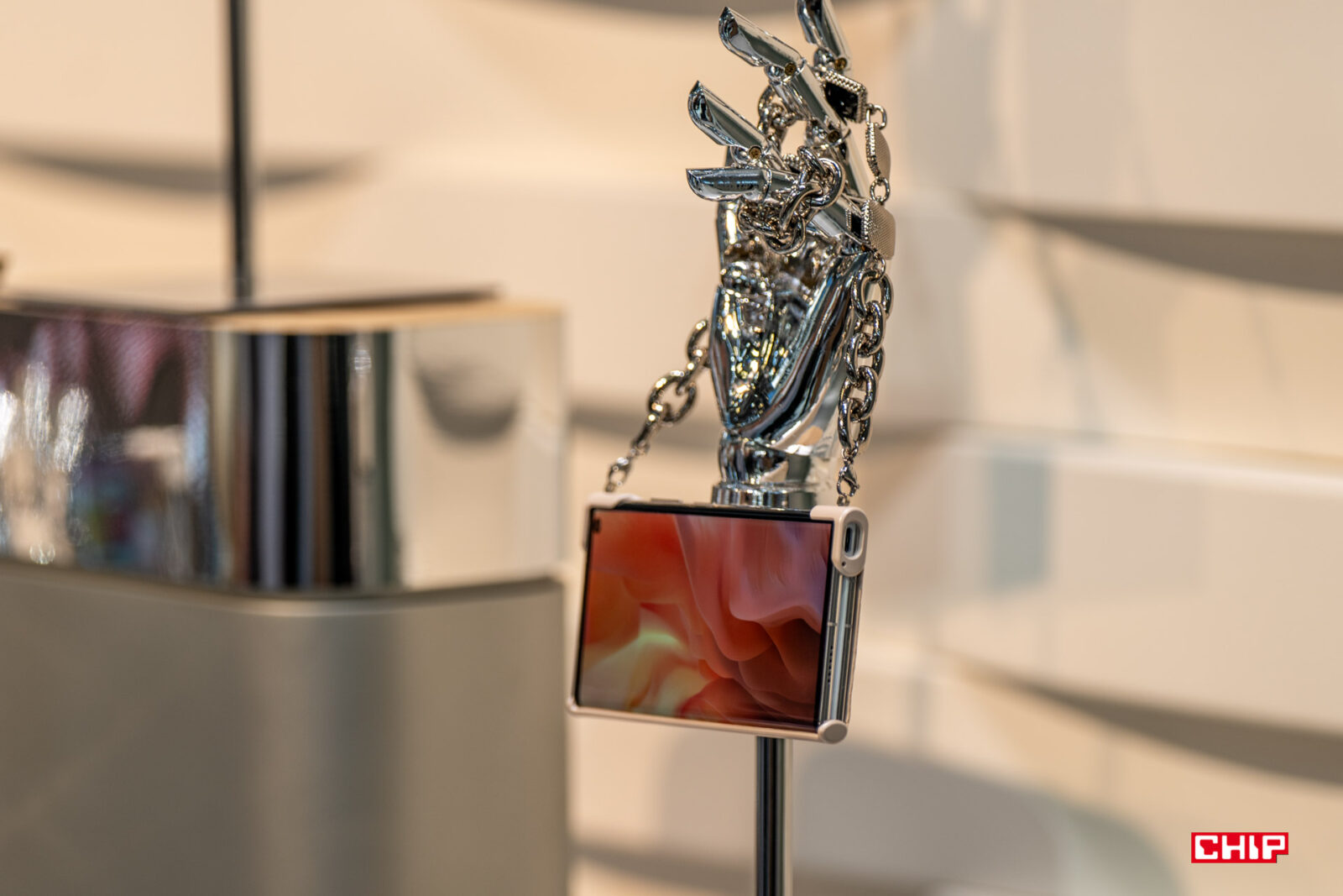 Koncepcyjny składany smartfon ma łączyć świat mody i technologii. Ma być nowoczesnym gadżetem, którego głównym zadaniem ma być pełnienie roli ozdobnej. Dlatego też do specjalnie stworzonego pokrowca można przypiąć łańcuszek lub pasek z wegańskiej skóry i całość nosić jako torebkę.