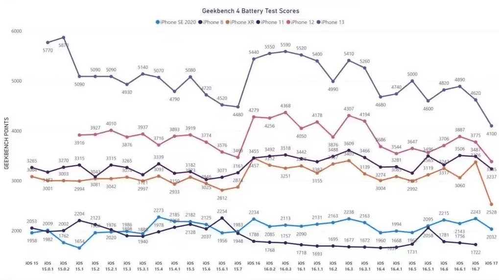 W teście sprawdzono pięć różnych modeli iPhone’a: iPhone SE 2, iPhone XR, iPhone 11, iPhone 12 i iPhone 13. Korzystając z funkcji testu baterii w Geekbench, iAppleBytes doszedł do przygnębiających wniosków – narzekający użytkownicy mieli rację. Po aktualizacji „żywotność akumulatora wszystkich tych starszych modeli naprawdę się zmniejszyła”. Warto wspomnieć, że iPhone 13 i iPhone XR doświadczyły znacznych spadków czasu ładowania, a iPhone XR zaprezentował najgorszą wydajność akumulatora od czasu wprowadzenia iOS 14.