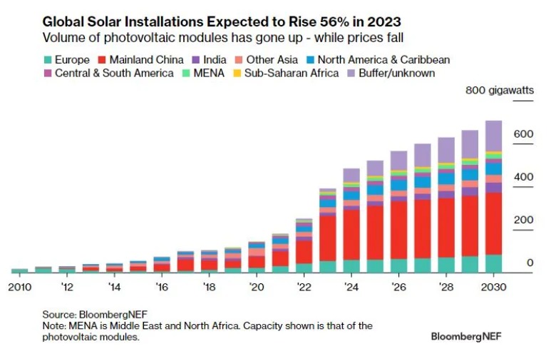 W ramach spisu zatytułowanego 3Q 2023 Global PV Market Outlook analitycy stwierdzili, że tylko w 2023 roku zamontowanych zostanie wiele nowych instalacji fotowoltaicznych, których wolumen mocy wyniesie łącznie 392 GW. Prognozy na przyszłość są optymistyczne i w dużej mierze jest to pokłosiem przyspieszenia w Chinach oraz szybkiego rozwoju na innych ugruntowanych rynkach.