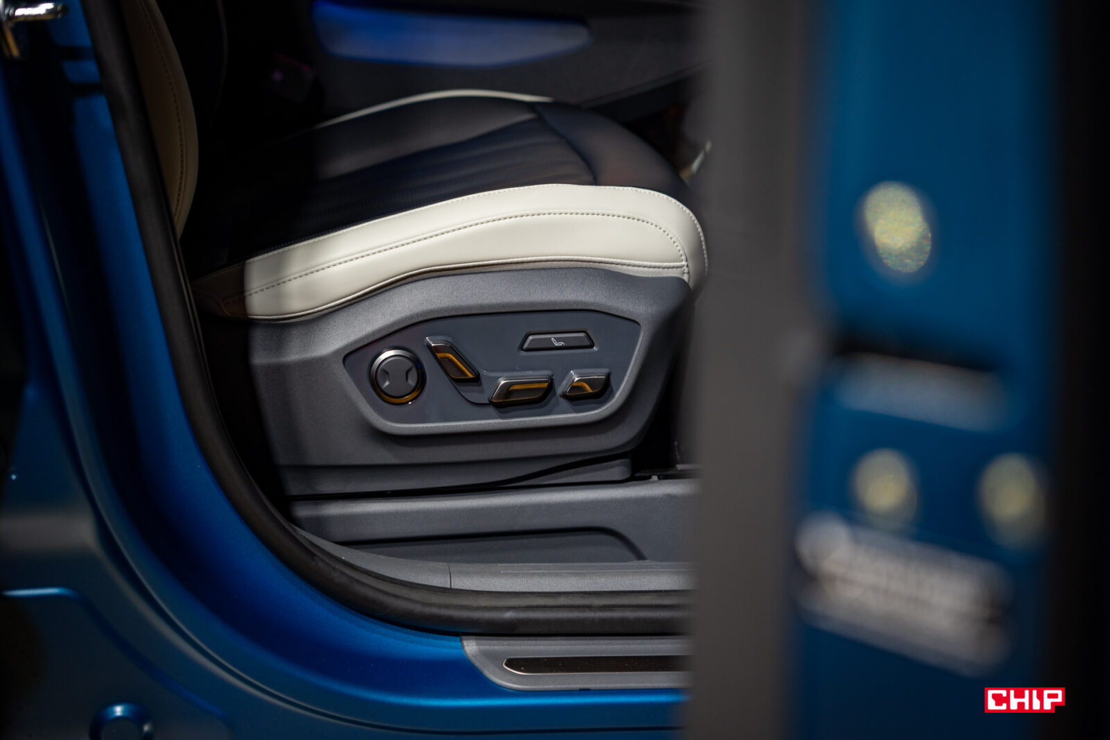 Już w podstawie dostaniemy… dużo. Automatyczne hamowanie w sytuacji zagrożenia, 9 poduszek powietrznych, światła LED, asystenta pasa i martwego pola, kamery monitorujące zmęczenie kierowcy, czujniki parkowania, elektrochromatyczne lusterko z podglądem widoku z kamery cofania, tempomat z funkcją stop & go, podgrzewane i wentylowane siedzenia z przodu oraz skrajne drugiego rzędu, podgrzewana kierownica, pompa ciepła, przygotowanie baterii do szybkiego ładowania, trzy ekrany (2x 12,3 cala i 5,3 cala do sterowania klimatyzacją) i 19 calowe aluminiowe felgi.