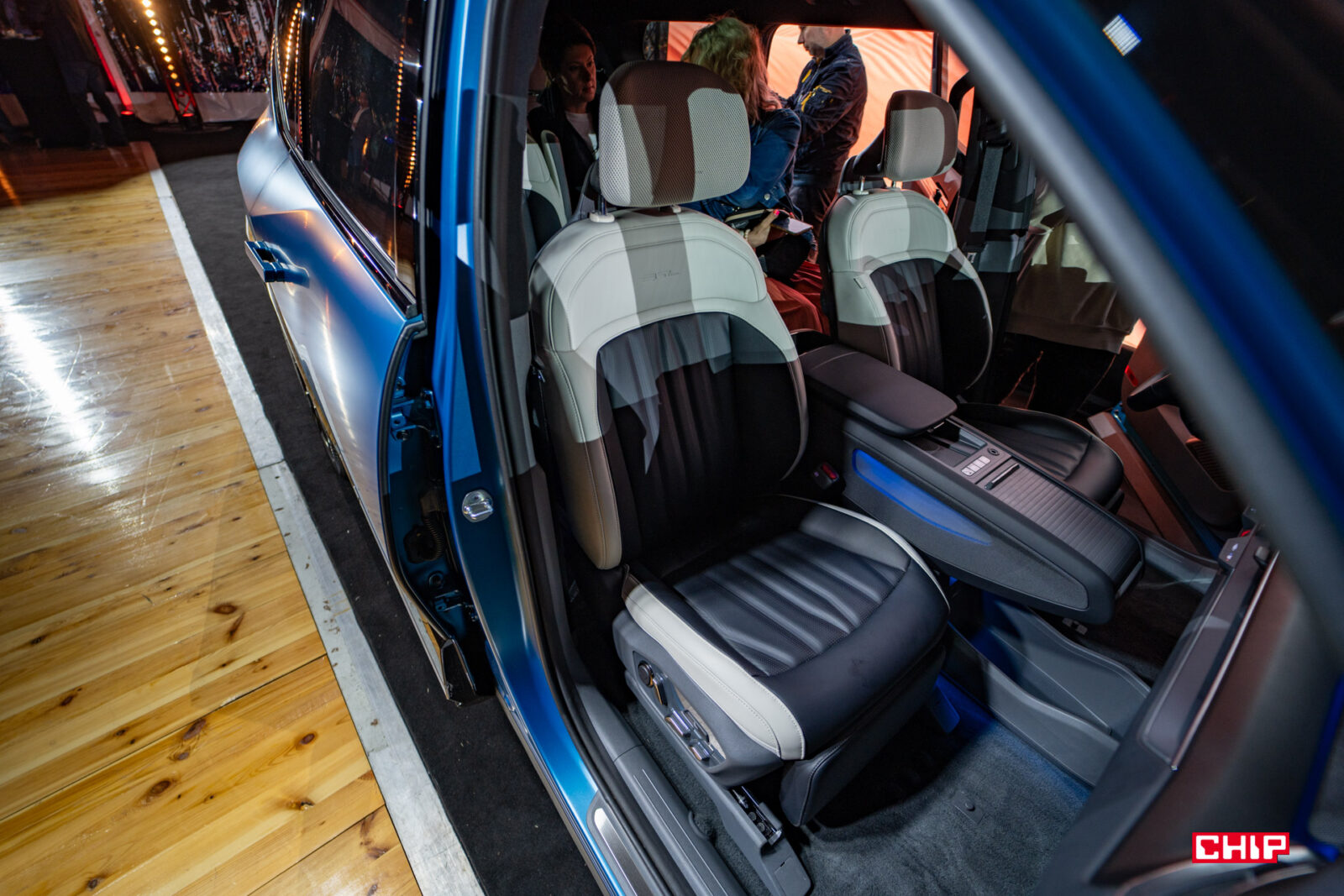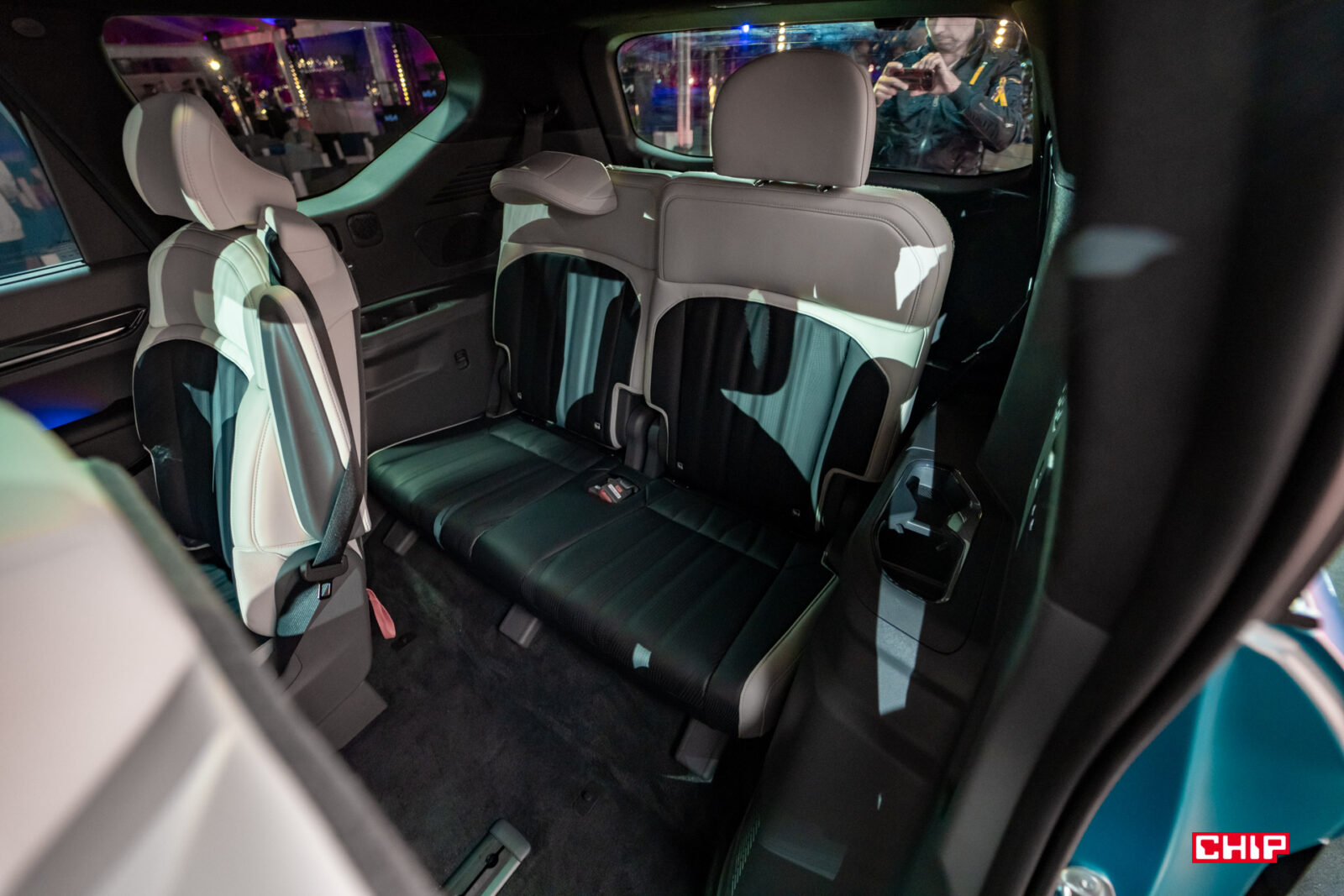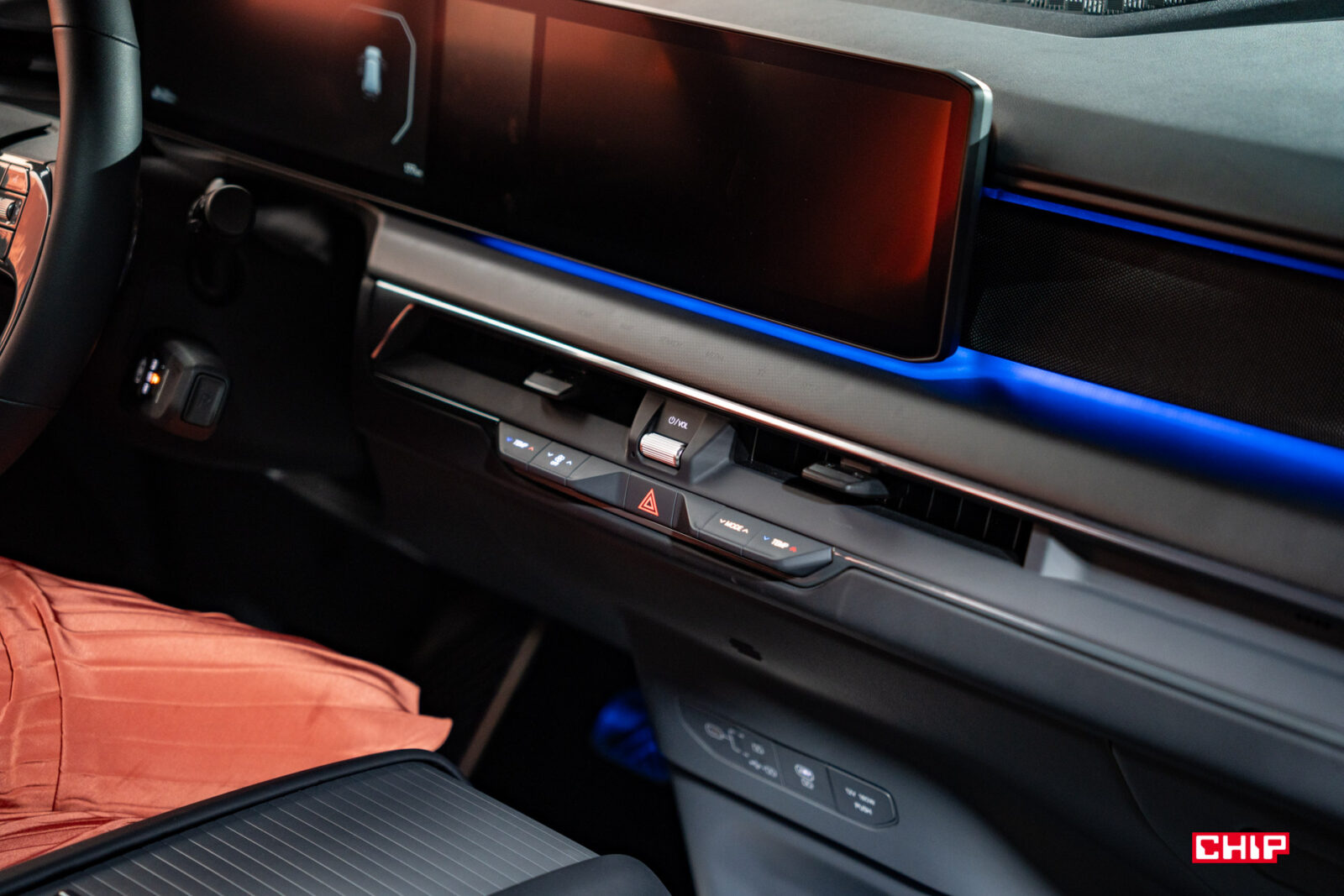 Jeśli chodzi o wnętrze to tutaj, póki co, niewiele mogę powiedzieć. To, co dało się zauważyć, to wysoka jakość wykonania, a materiały częściowo pochodzą z recyklingu. Miejsca jest bardzo dużo i nawet w trzecim rzędzie foteli powinno dać się całkiem komfortowo podróżować i wcale nie trzeba mieć 150 cm wzrostu. Ciekawi mnie jak w praktyce wypadnie ergonomia obsługi, bo część przycisków jest dotykowa (haptyczna), a już Nissan modelu Ariya pokazał, że da się to dobrze zrobić. Nowością jest też przeniesienie selektora zmiany kierunku jazdy obok kierownicy, a także sterowania klimatyzacją na osobny, nieco ponad 5-calowy ekran umieszczony między wyświetlaczem kierowcy a wyświetlaczem głównym.