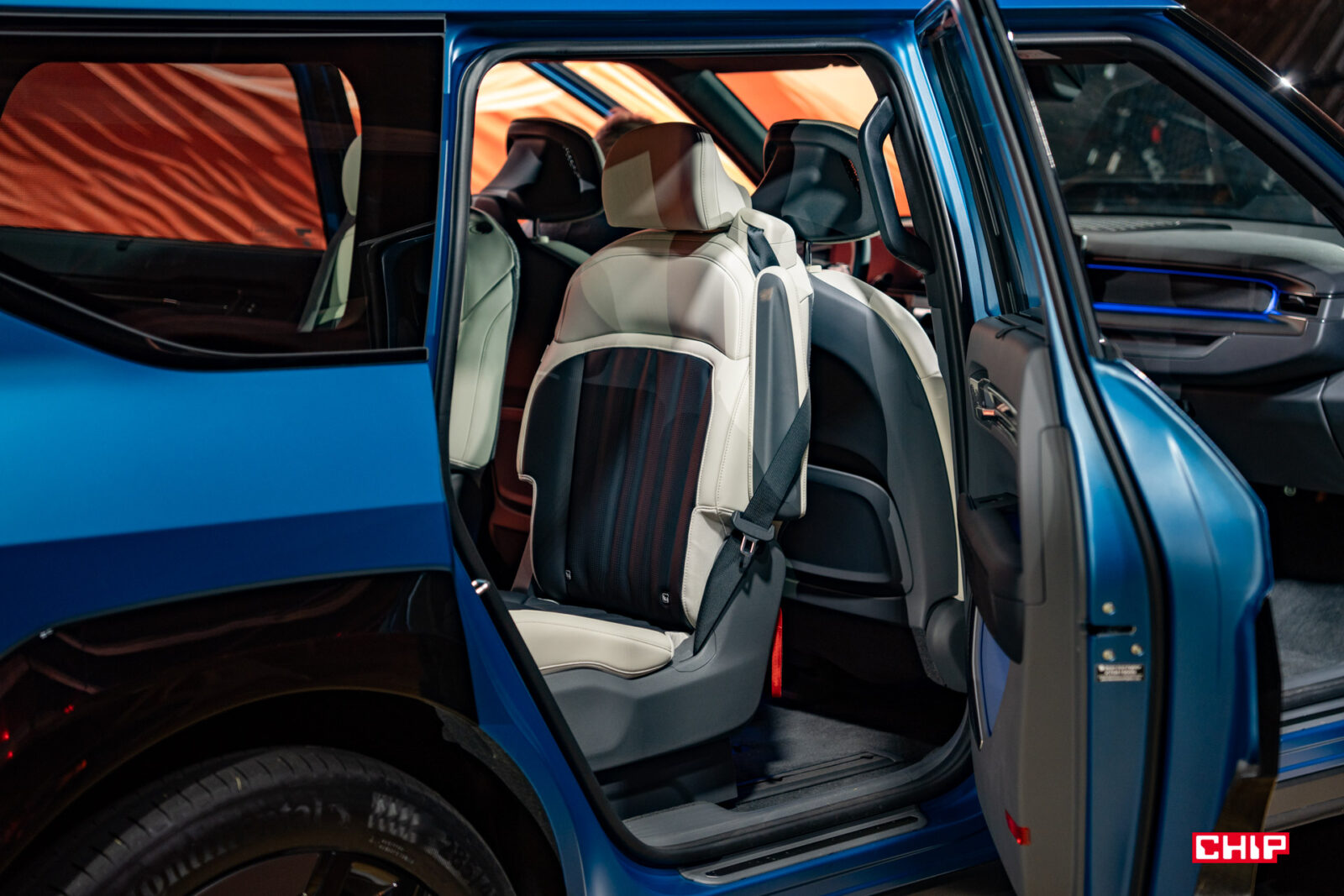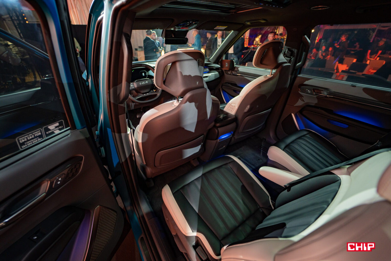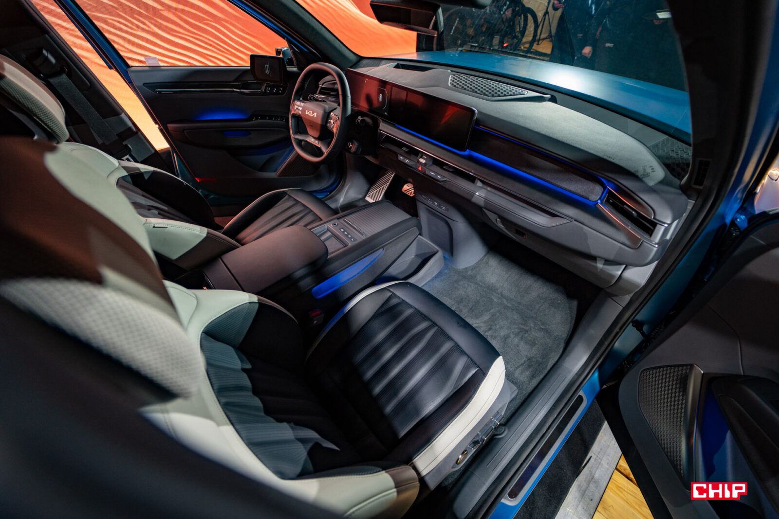 Bardzo efektowny jest też widoczny na zdjęciach lakier. To matowy Ocean Blue dostępny wyłącznie w pakiecie GT-Line. W macie będzie też dostępny srebrny Ivory Silver w pakiecie Earth. Słowem wyjaśnienia, EV9 nie będzie dostępny w wariantach S, M, L, itd. jak pozostałe modele Kia, a w dwóch – Earth i GT-Line.