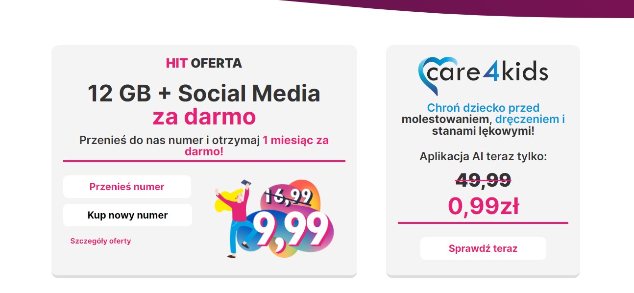 Warto też wspomnieć, że nowy operator oferuje też świetną aplikację, która powinna spodobać się wszystkim rodzicom dbającym o bezpieczeństwo swojego dziecka. Care4Kids wykorzystuje algorytmy sztucznej inteligencji, by analizować, jak dzieci korzystają z usług komórkowych i internetu na telefonie. Notowane są zmiany i zaburzenia nastrojów (dzięki czemu można wcześnie wykryć objawy depresji), a apka jest też w stanie rozpoznać treści niepokojące, takie jak dręczenie czy molestowanie. Jest to jedyne takie rozwiązanie na świecie, które zapewnia pełne monitorowanie 24/7 zachowań naszych najbliższych. Aplikacja oprócz wychwytywania niebezpiecznych treści, może blokować nieodpowiednie strony i zdjęcia, alarmować przez niebezpieczeństwem, a nawet odbierać głosy i obrazy w sytuacjach zagrożenia.
