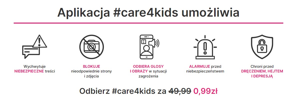 Dostęp do Care4Kids kosztuje jedynie 0,99 zł przez pierwsze dwa miesiące, natomiast od trzeciego miesiąca obowiązywać będzie cena promocyjna 29,99 zł! (regularna cena 49,99 zł). Taka aplikacja może naprawdę przydać się wielu rodzicom, zwłaszcza gdy mają oni podejrzenia, że ich dziecko może mieć problemy z rówieśnikami lub ma kontakt z nieodpowiednimi treściami w sieci.