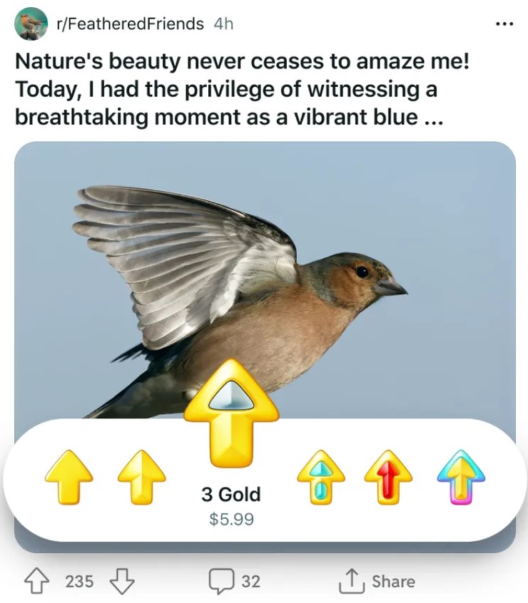 Dlatego dotychczasowe bezwartościowe złoto będzie można zamienić na pieniądze w ramach nowego, ogłoszonego właśnie programu. Zacznijmy najpierw od zmian w Reddit Gold, a więc najważniejszej części nowego rozwiązania. Teraz klikając przycisk głosowania „za” na telefonie czy komputerze, będzie można kupić złoto. Dostępne będzie sześć różnych opcji – od 1,99 dol za 1 sztukę złota, do 49 dolarów za 25 sztuk. Poprzedni system umożliwiał oprócz przyznawania złota, także ofiarowywanie innym wielu różnych nagród, w tym takich dostosowanych do poszczególnych subredditów. Jednak monety w ramach Reddit Coins oficjalnie zniknęły 12 września, więc nie można ich używać do nagradzania złota w ramach nowego systemu.