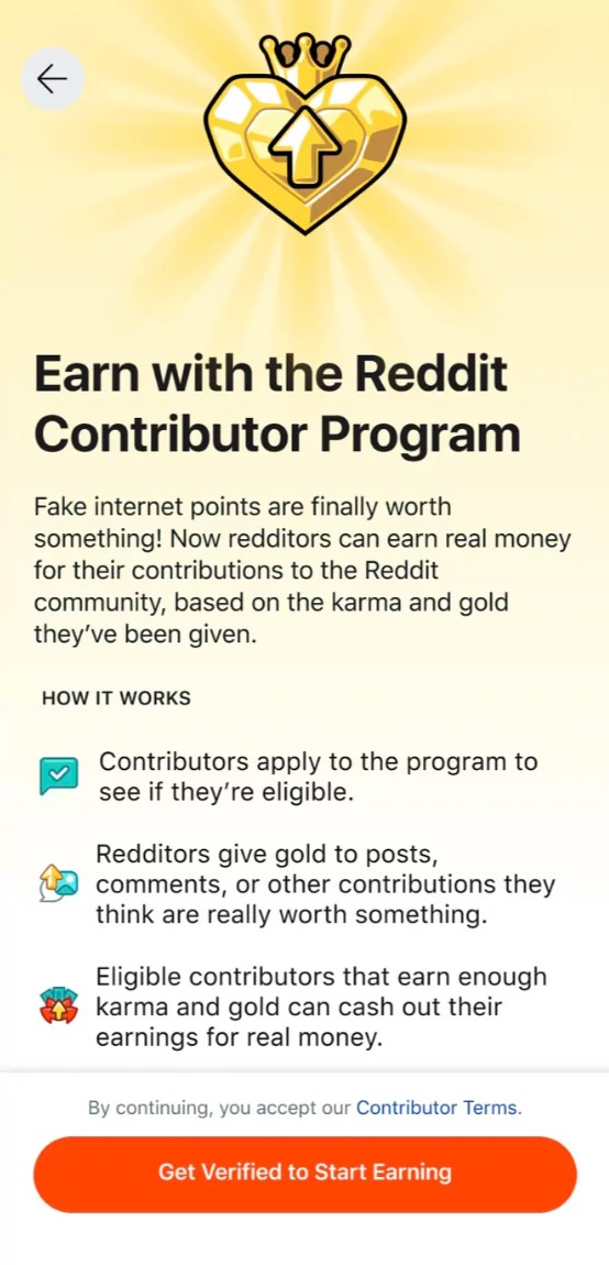 Idea jest taka, by na swoich wpisach mógł zarabiać prawie każdy, kogo posty są popularne. Na razie jednak dotyczy to tylko użytkowników z USA. Ci muszą mieć ukończone 18 lat oraz poddać się weryfikacji za pośrednictwem usług Persona lub Stripe. To oczywiście nie wszystko, bo do programu trzeba się zakwalifikować, a do tego potrzeba zdobyć co najmniej 100 karmy i 10 sztuk złota w ciągu ostatnich 12 miesięcy. Jeśli kwalifikujecie się do programu, odpowiednią sekcję znajdziecie po kliknięciu w swój awatar w prawym górnym rogu (w aplikacji mobilnej). Tam musicie wejść w „Contributor Program”, poddać się weryfikacji i tyle. Po tych kilku krokach możecie już zarabiać.