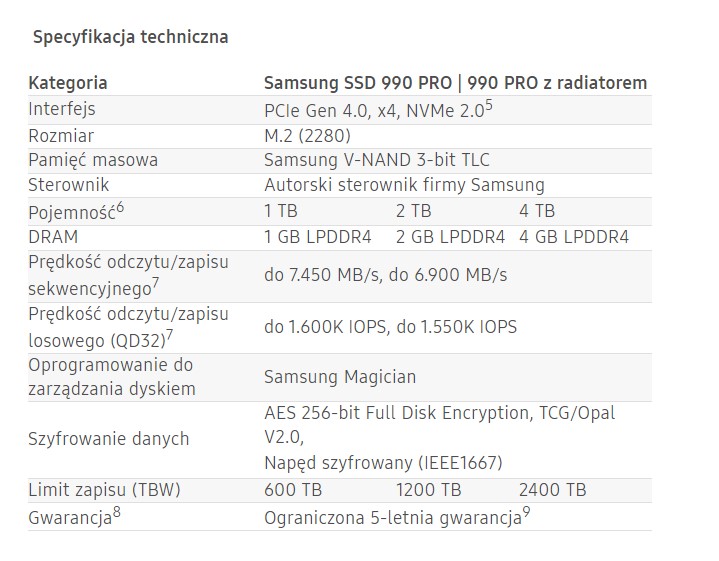 Jeśli wierzyć niektórym testerom, a przede wszystkim zapewnieniom firmy, 990 Pro to jedne z najszybszych aktualnie dysków SSD na rynku, których sekwencyjny odczyt i zapis wynosi odpowiednio 7450 i 6900 MB/s. Nośnik obsługuje również wbudowane szyfrowanie, wyróżnia się wysoką niezawodnością (mowa o 5-letniej gwarancji opatrzonej ograniczeniem 2400 TBW) oraz kompatybilnością z konsolą PlayStation 5 nawet w wersji z radiatorem.