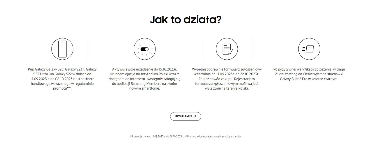 W kolejnym kroku, jaki należy wykonać do 15 października, trzeba aktywować smartfon z kartą SIM polskiego operatora, akceptując przy okazji postanowienia umowy licencyjnej użytkownika końcowego (EULA). Następnie konieczne jest zalogowanie się do aplikacji Samsung Members i wypełnienie tam formularza zgłoszeniowego. Tam podajemy swoje podstawowe dane, w tym adres, na który mają zostać wysłane słuchawki Galaxy Buds 2 Pro (dostarczane będą jedynie na terenie polski!) oraz dołączamy dowód zakupu jednego ze smartfonów Samsunga. Na ten krok mamy czas do 22 października.