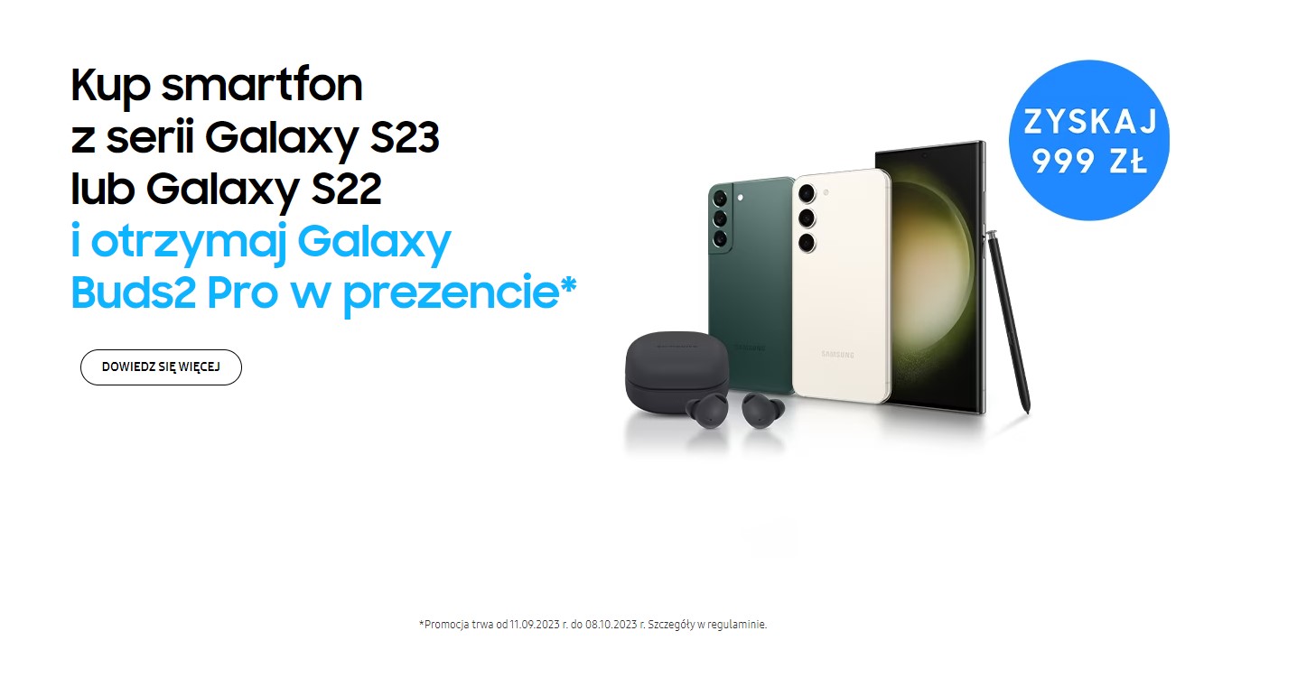 Promocja wystartowała 11 września i potrwa do 8 października. Zasady są proste i zapewne dobrze wszystkim znane, by móc otrzymać słuchawki w prezencie, musimy w określonym terminie zakupić smartfon – Galaxy S23 Ultra, Galaxy S23+, Galaxy S23 lub Galaxy S22 – u jednego z partnerów handlowych Samsunga. Producent wymienił takie sklepy, jak RTV Euro AGD, oleole.pl, Media Expert, Media Markt, NEONET (z NEO24.pl), Komputronik, Vobis, Max Elektro czy x-kom. Jak widzicie, nie ma tutaj wymienionych operatorów komórkowych, więc tym razem kupiony u nich sprzęt nie będzie objęty ofertą – pamiętajcie o tym.