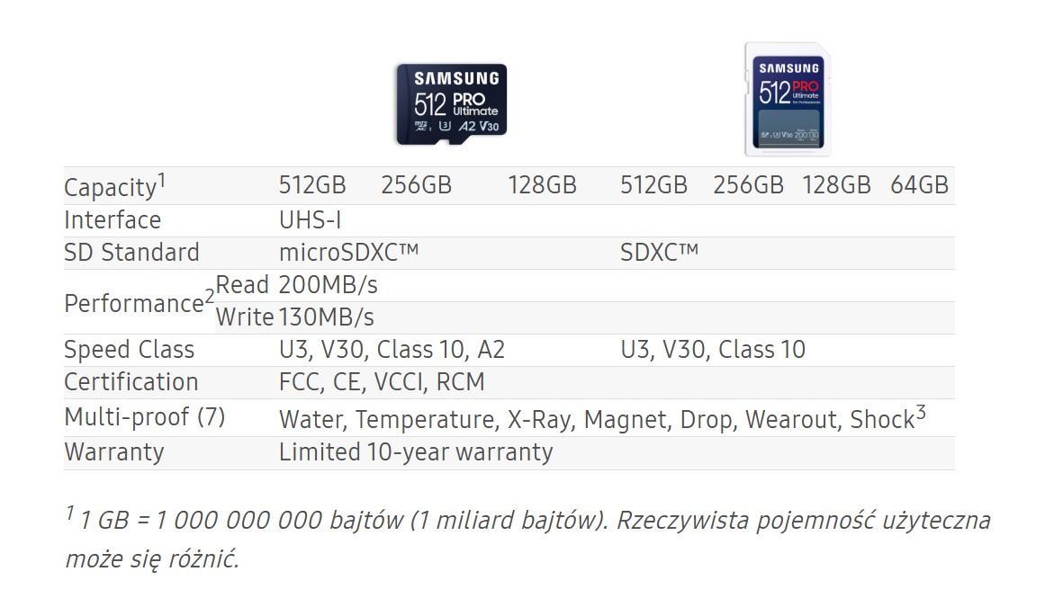 Seria nośników PRO Ultimate składa się z kart formatu microSDXC o pojemnościach od 128 GB do 512 GB oraz pełnowymiarowych kart SDXC o pojemnościach od 64 GB do 512 GB, przy czym w handlu będzie można znaleźć nie tylko same karty, ale także zestawy z szybkim czytnikiem.