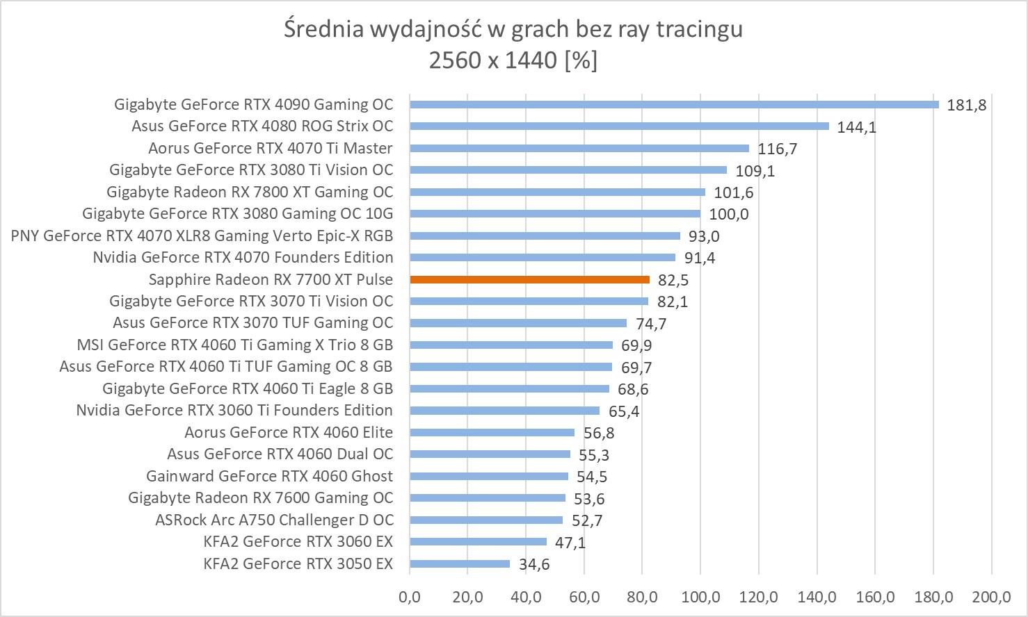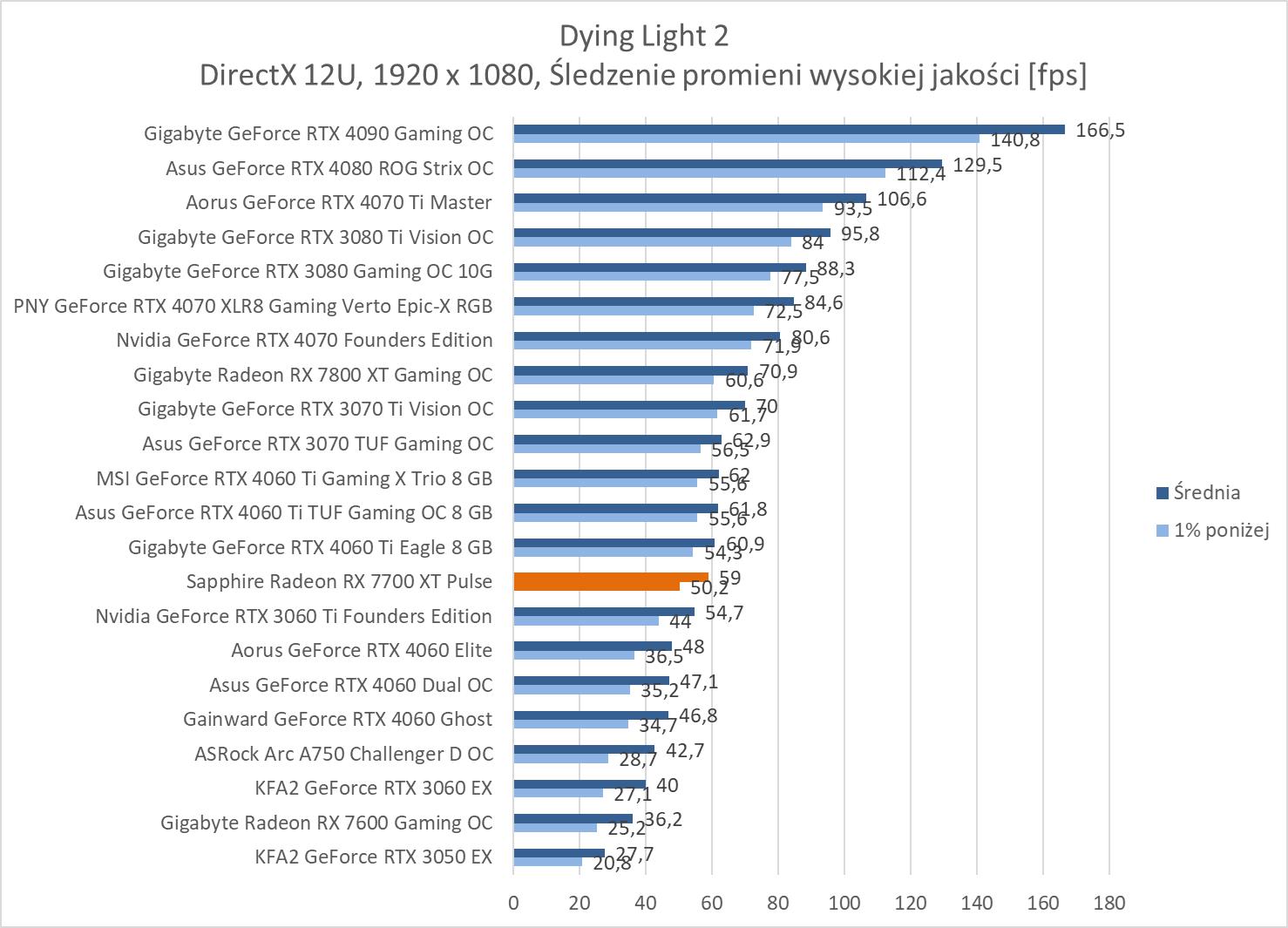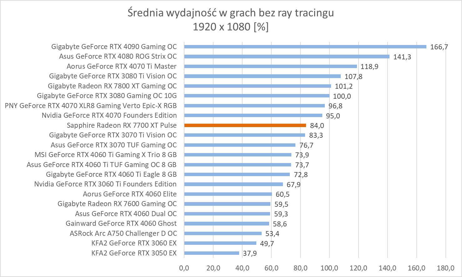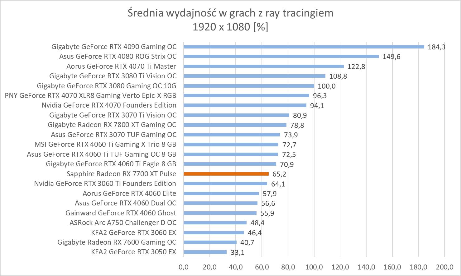 Przewaga nad niepodkręconym RTX 4060 Ti (Gigabyte Eagle) wynosi kolejno ok. 15,4%, 20,3% oraz 22,9%. W szczególności wzrost wydajności w wyższych rozdzielczościach jest spory. Bez wątpienia RX 7700 XT jest w grach bez ray tracingu znacznie wydajniejszy i tutaj nawet nie ma co z tym dyskutować. Warto też zauważyć, że w dwóch pierwszych rozdzielczościach testowany model minimalnie wyprzedza RTX 3070 Ti.