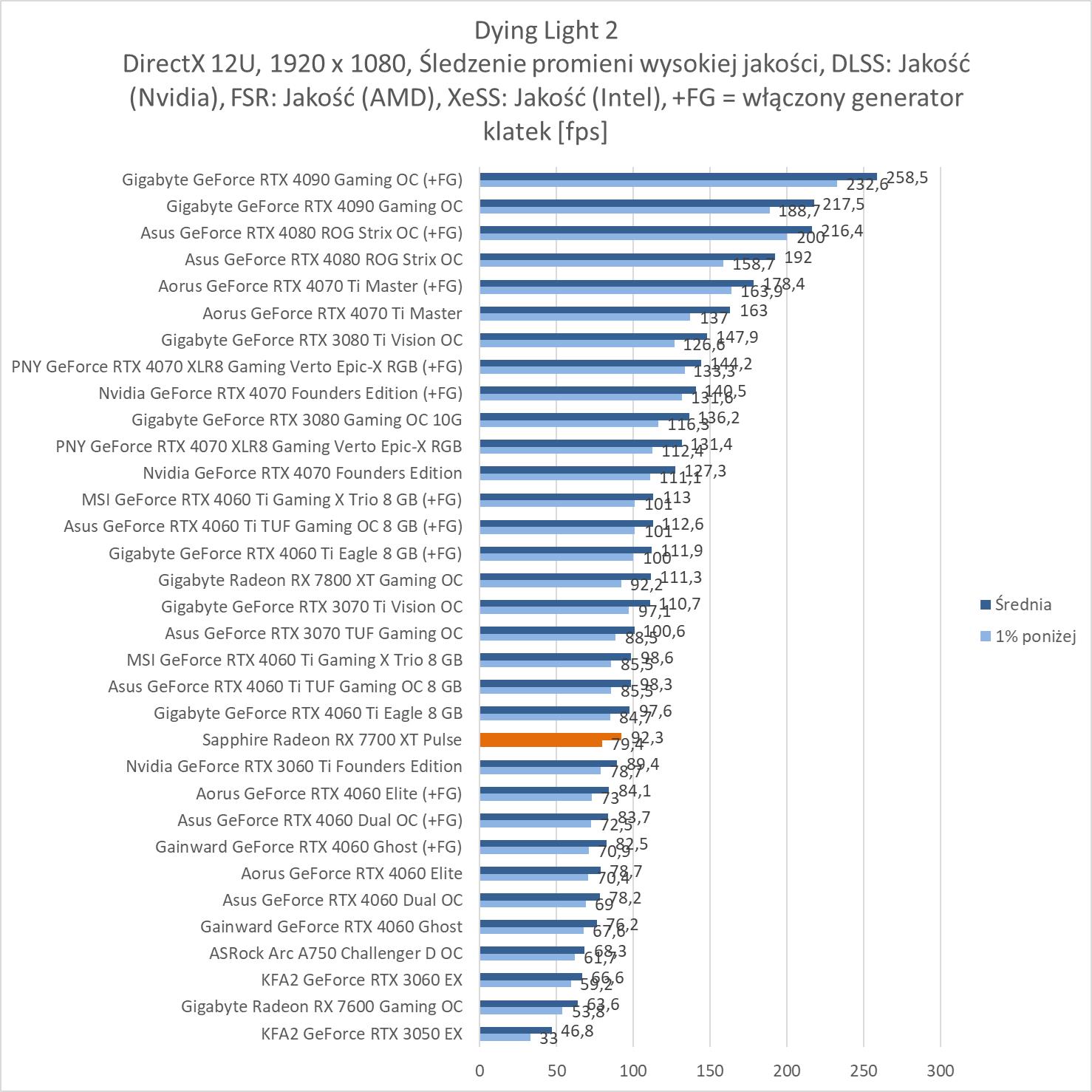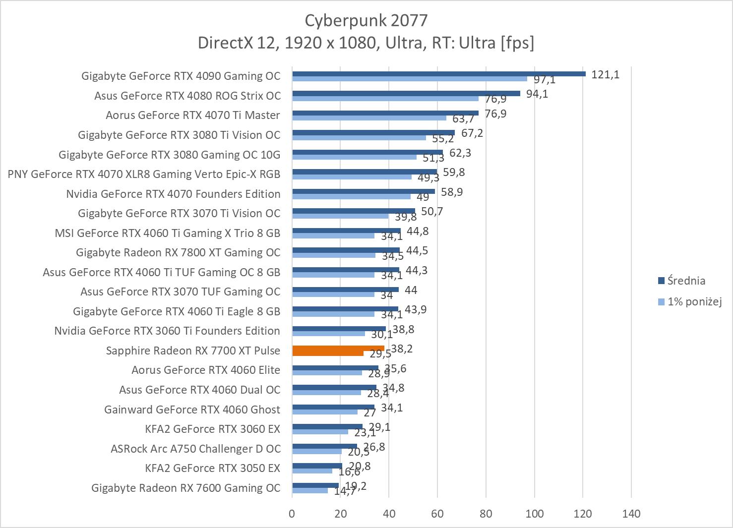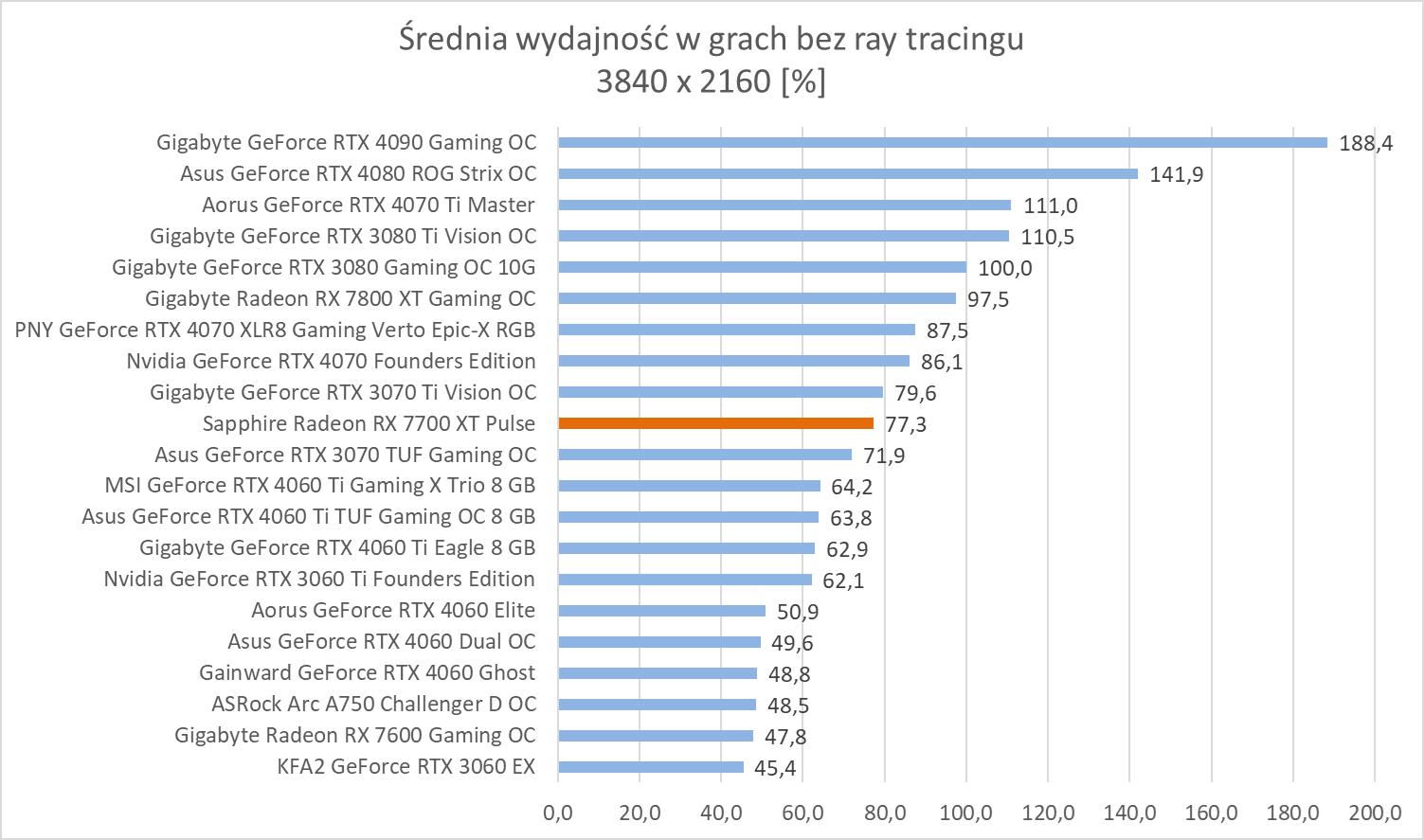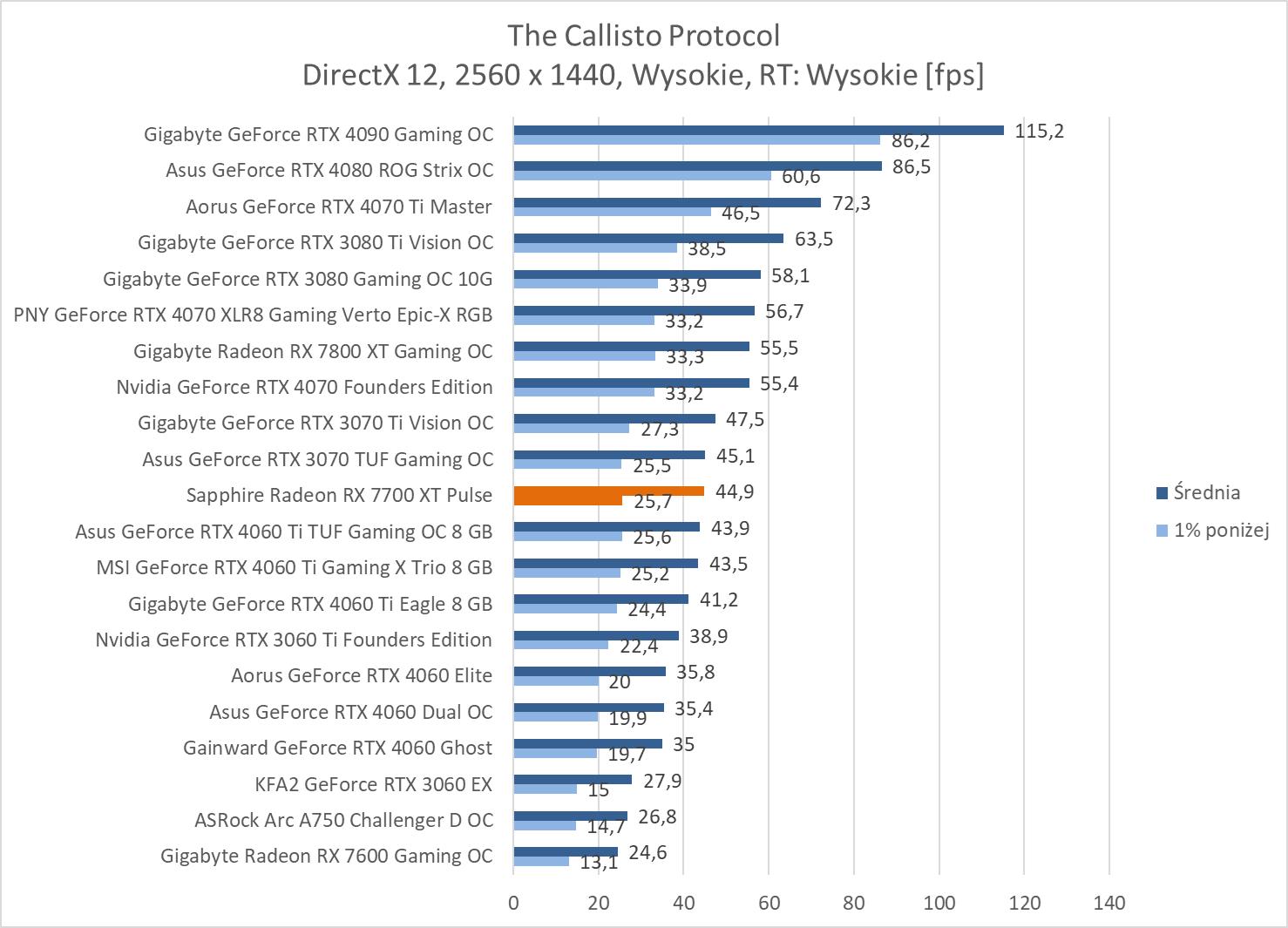 Przewaga nad niepodkręconym RTX 4060 Ti (Gigabyte Eagle) wynosi kolejno ok. 15,4%, 20,3% oraz 22,9%. W szczególności wzrost wydajności w wyższych rozdzielczościach jest spory. Bez wątpienia RX 7700 XT jest w grach bez ray tracingu znacznie wydajniejszy i tutaj nawet nie ma co z tym dyskutować. Warto też zauważyć, że w dwóch pierwszych rozdzielczościach testowany model minimalnie wyprzedza RTX 3070 Ti.