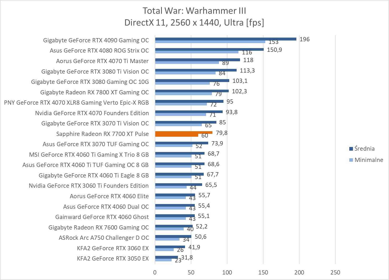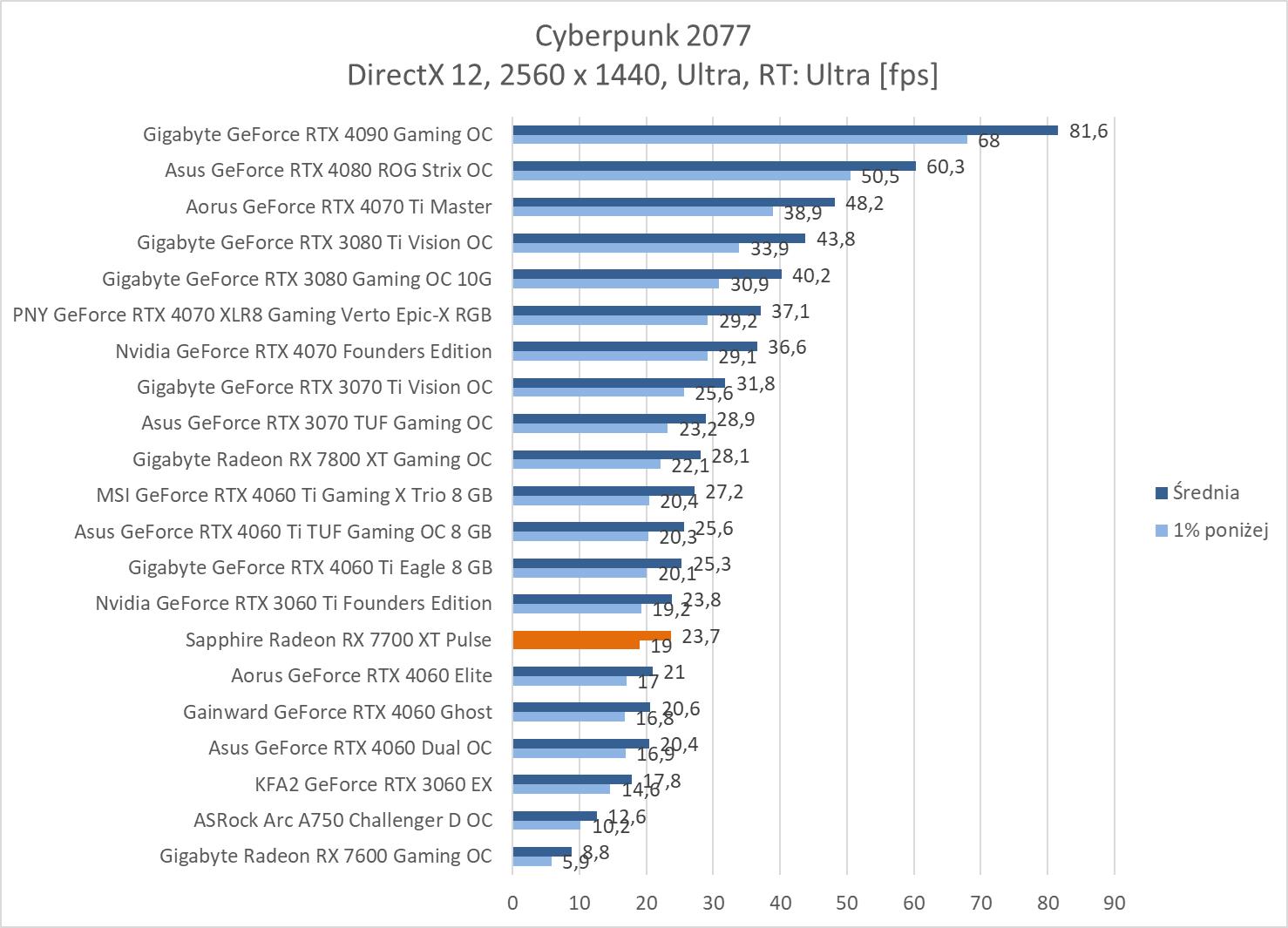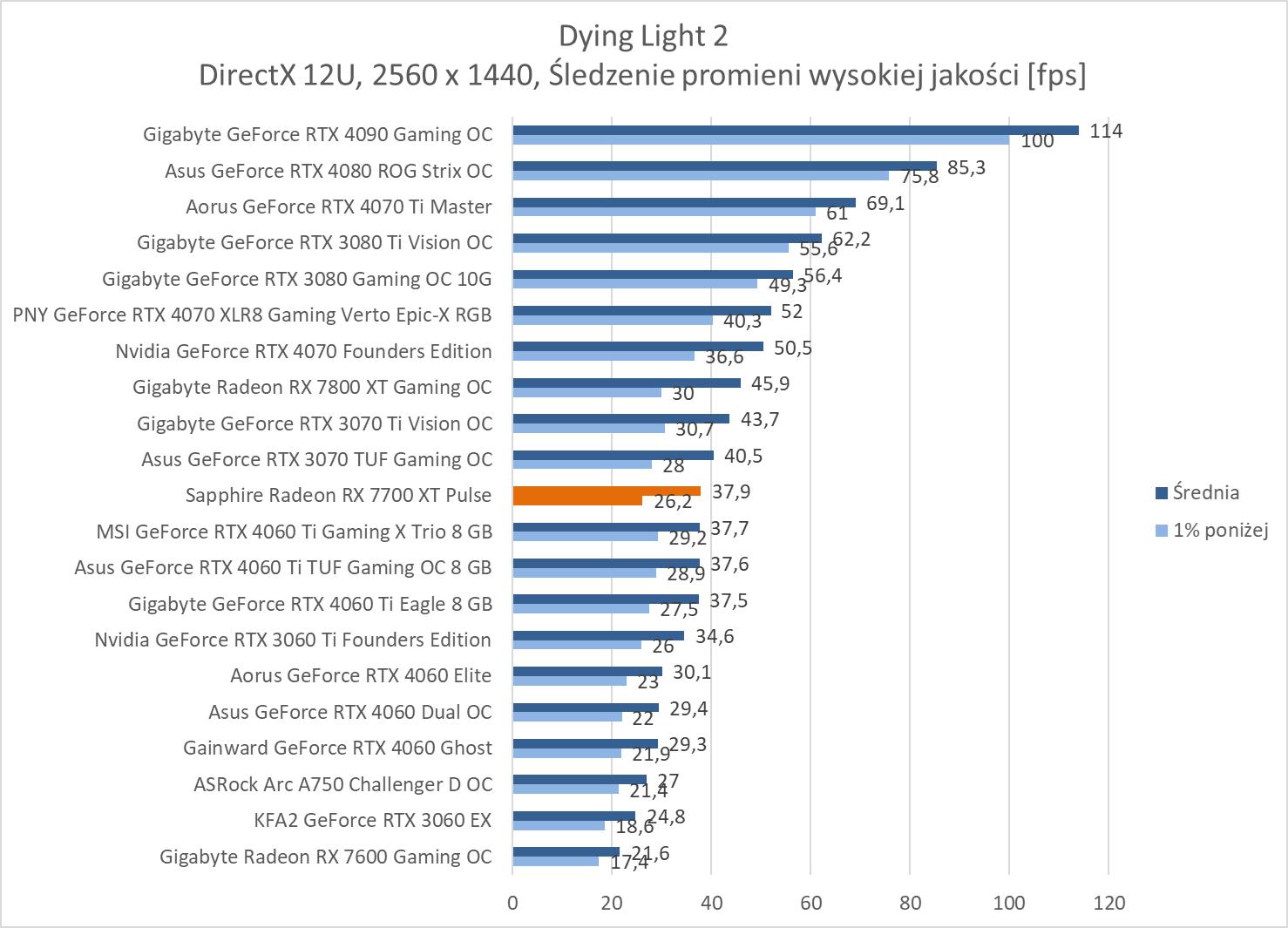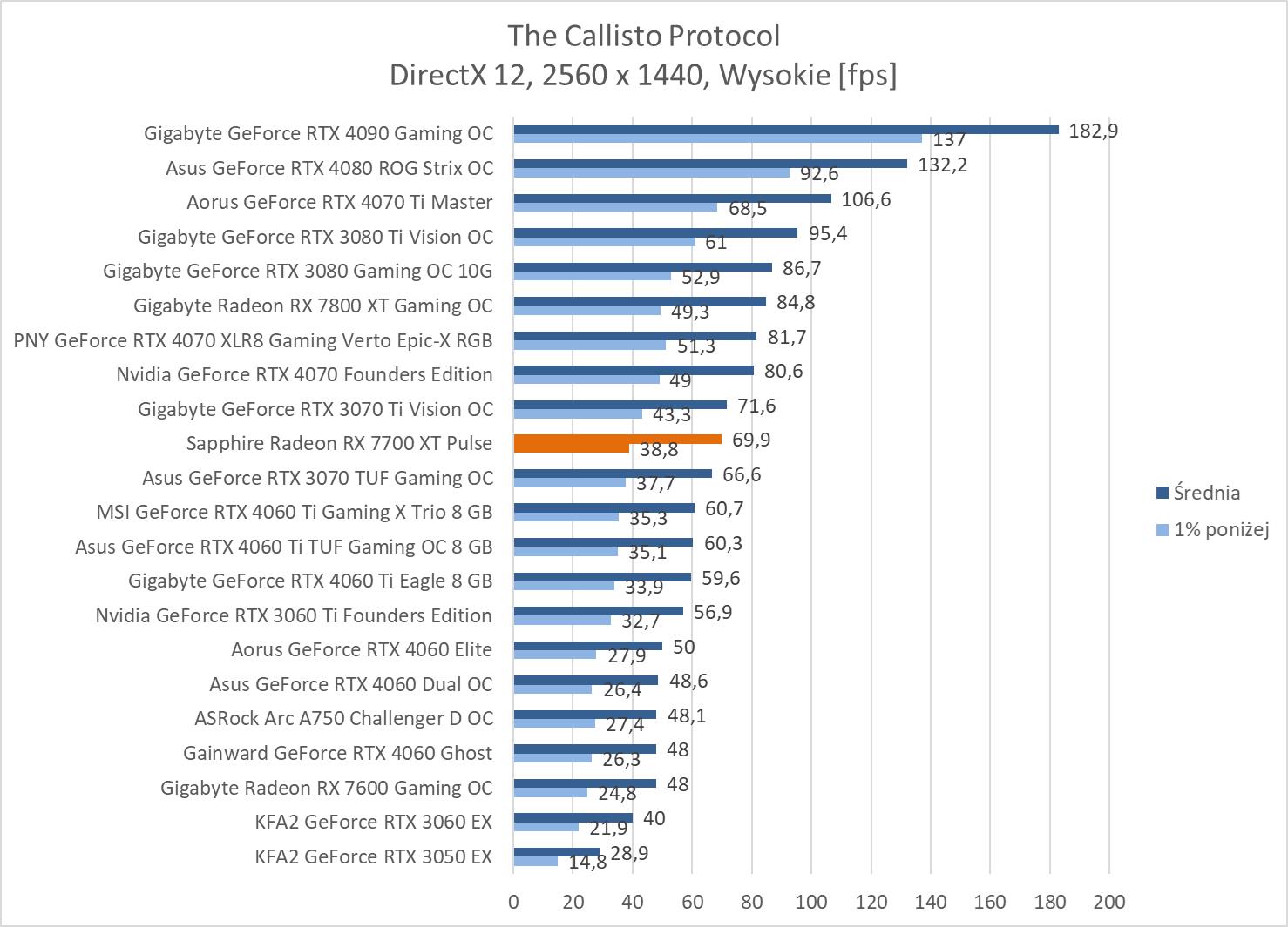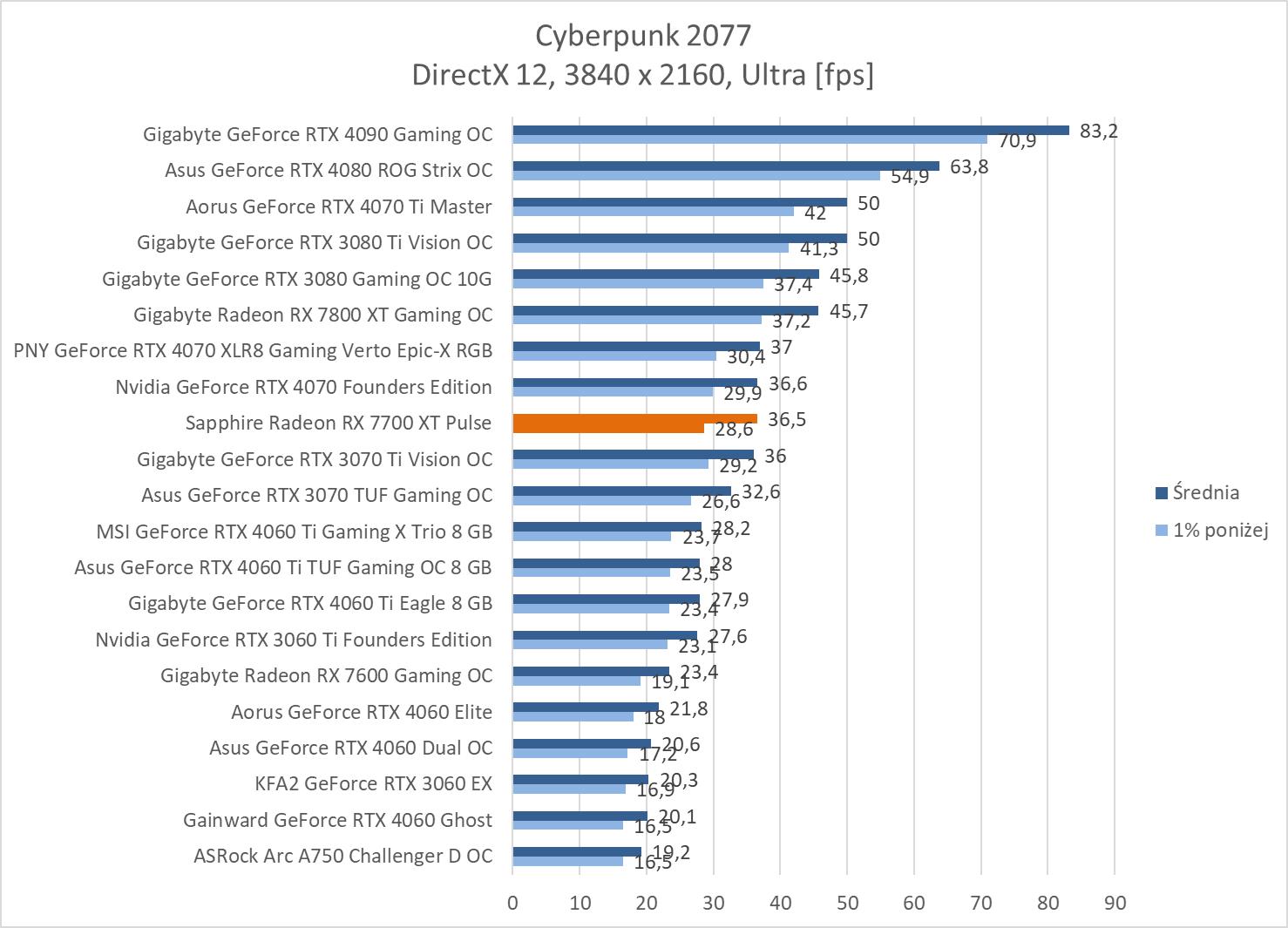 Przewaga nad niepodkręconym RTX 4060 Ti (Gigabyte Eagle) wynosi kolejno ok. 15,4%, 20,3% oraz 22,9%. W szczególności wzrost wydajności w wyższych rozdzielczościach jest spory. Bez wątpienia RX 7700 XT jest w grach bez ray tracingu znacznie wydajniejszy i tutaj nawet nie ma co z tym dyskutować. Warto też zauważyć, że w dwóch pierwszych rozdzielczościach testowany model minimalnie wyprzedza RTX 3070 Ti.