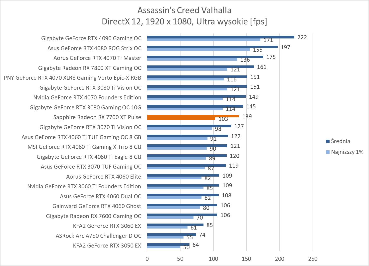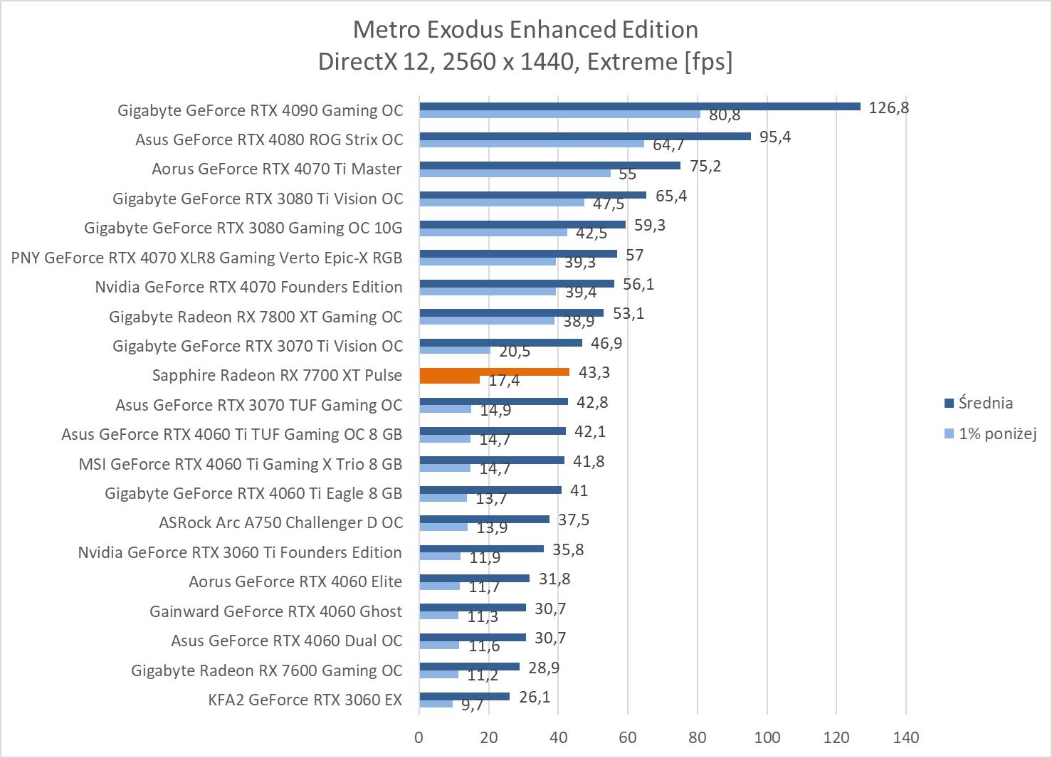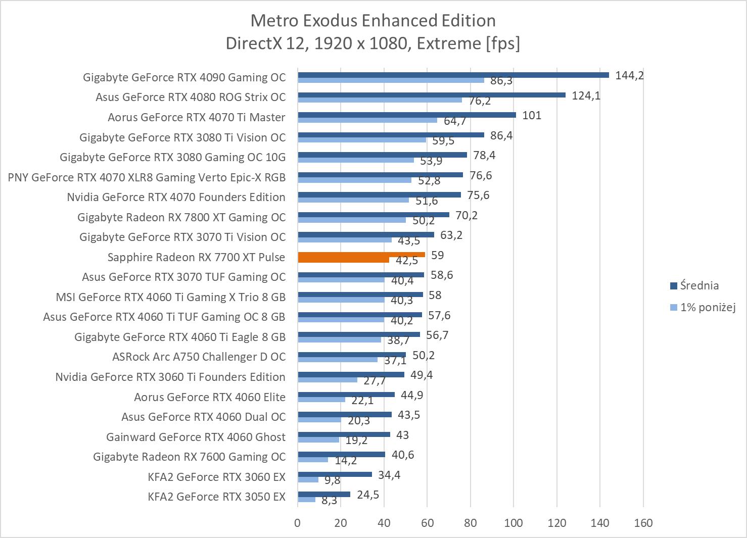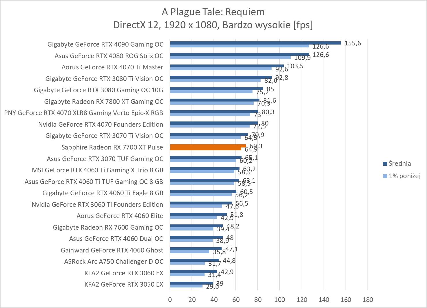 Przewaga nad niepodkręconym RTX 4060 Ti (Gigabyte Eagle) wynosi kolejno ok. 15,4%, 20,3% oraz 22,9%. W szczególności wzrost wydajności w wyższych rozdzielczościach jest spory. Bez wątpienia RX 7700 XT jest w grach bez ray tracingu znacznie wydajniejszy i tutaj nawet nie ma co z tym dyskutować. Warto też zauważyć, że w dwóch pierwszych rozdzielczościach testowany model minimalnie wyprzedza RTX 3070 Ti.