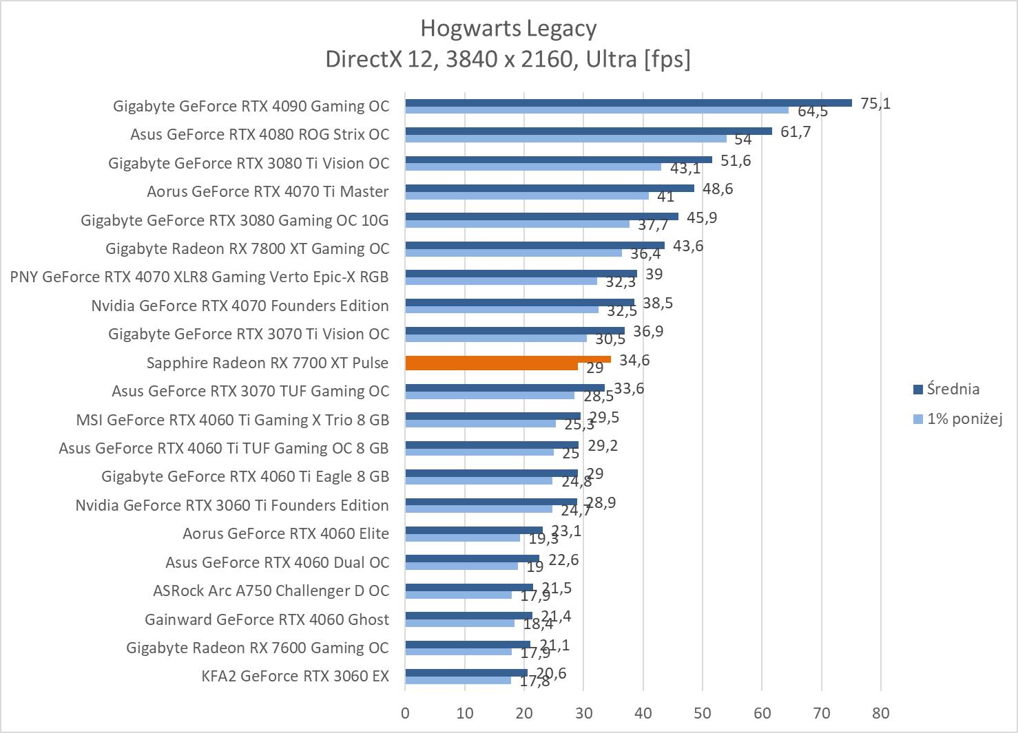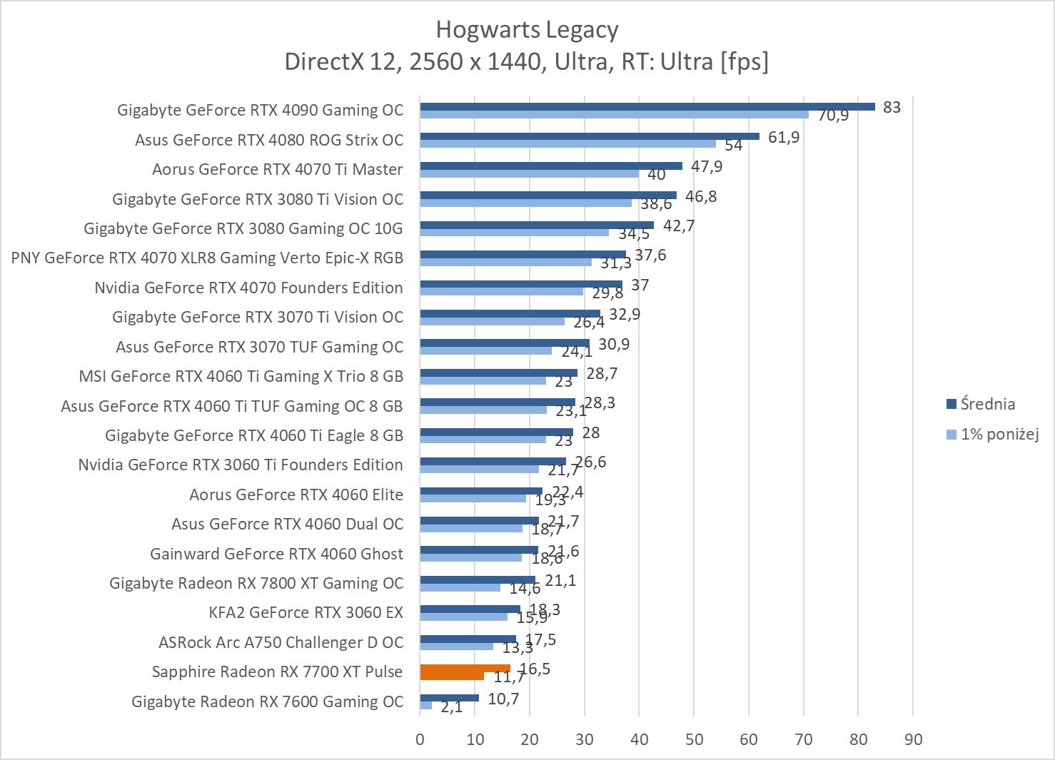 Ray tracing to rzecz, w której karty AMD zawsze gorzej wypadały. Teraz mamy jednak mamy jednak zaskoczenie, bowiem w dwóch tytułach Sapphire Radeon RX 7700 XT Pulse pokonuje RTX 4060 Ti, choć minimalnie. Z drugiej strony jest Hogwarts Legacy, gdzie wydajność jest tragiczna.