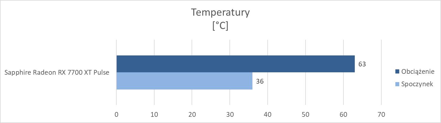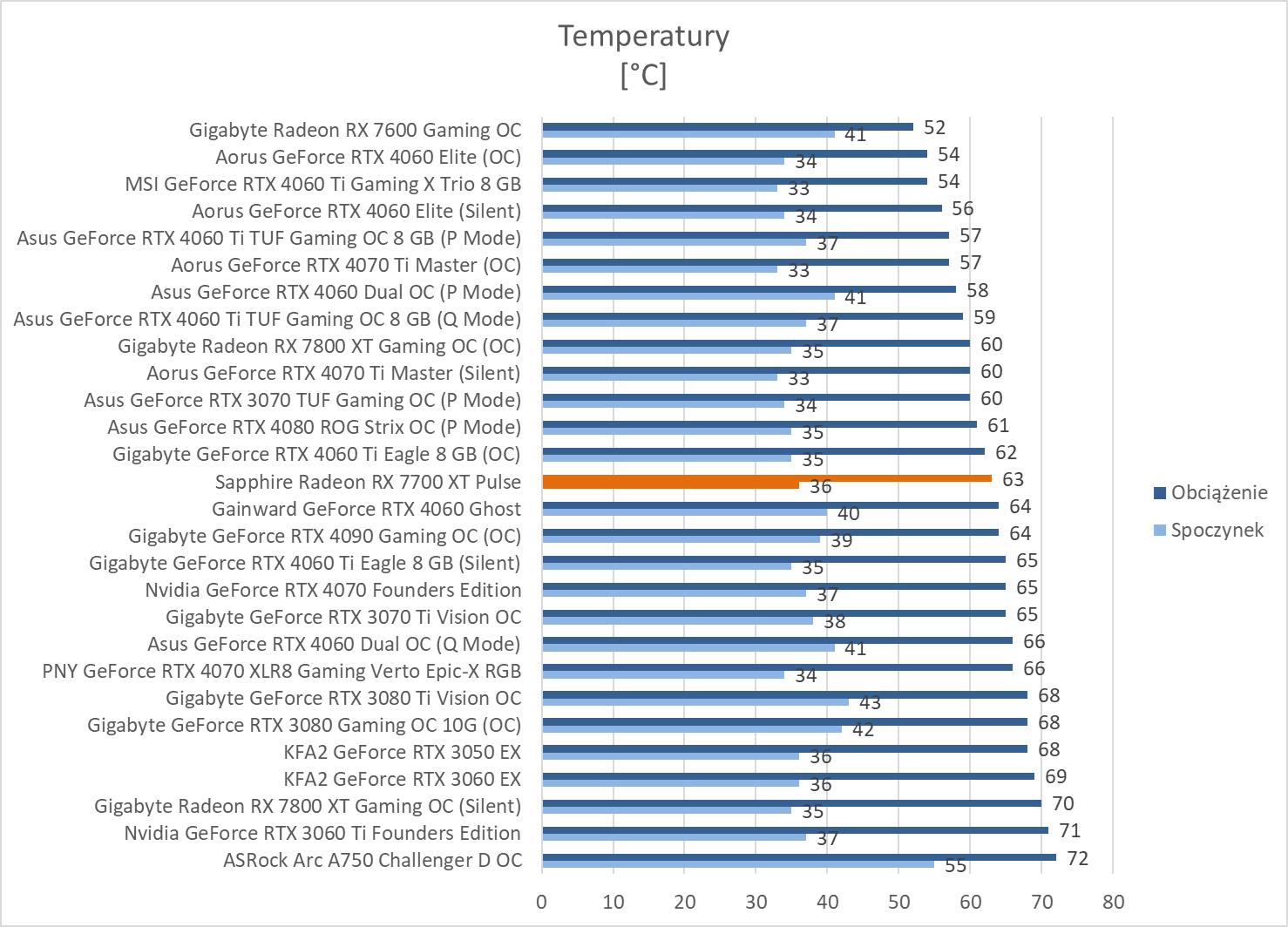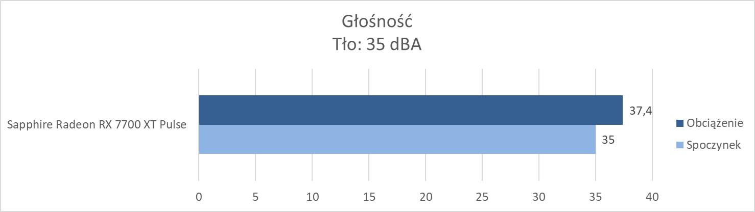 Sapphire Radeon RX 7700 XT Pulse jest bardzo cichą kartą, której nie usłyszycie pod obciążeniem. W spoczynku działa ona pasywnie, tak jak każdy z testowanych modeli.