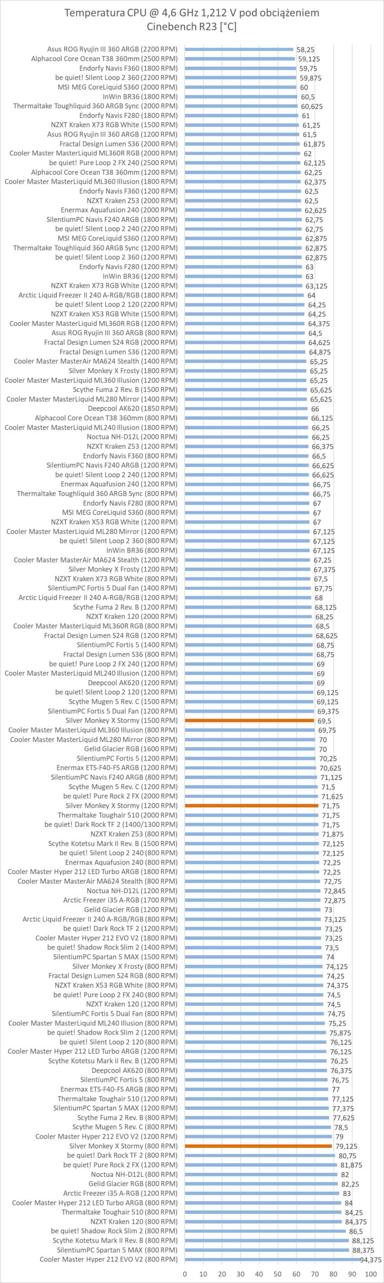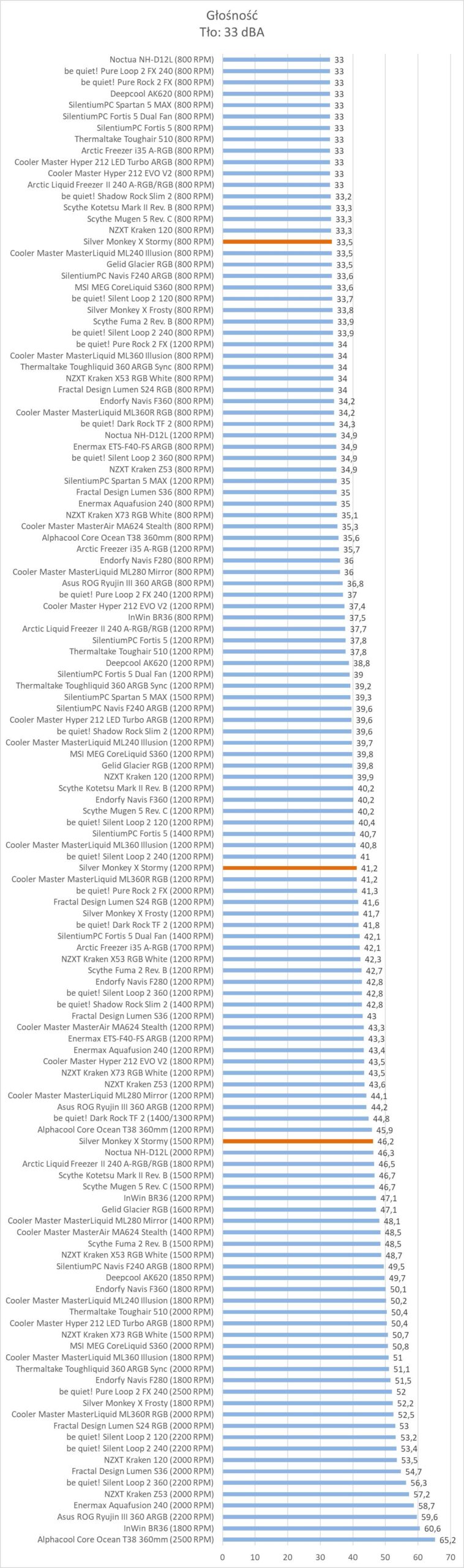 Chłodzenie również pod względem głośności wypada podobnie do Mugena 5. Jedynie na 1200 RPM jest trochę głośniej, tak to większych różnic nie ma. Tutaj jednak Fortis 5 jest znacznie cichszy. Silver Monkey X Stormy na maksymalnych obrotach będzie więc słyszalne, ale nie jest źle. Na 1200 RPM jest już dobrze, a na 800 RPM jego nie usłyszycie.