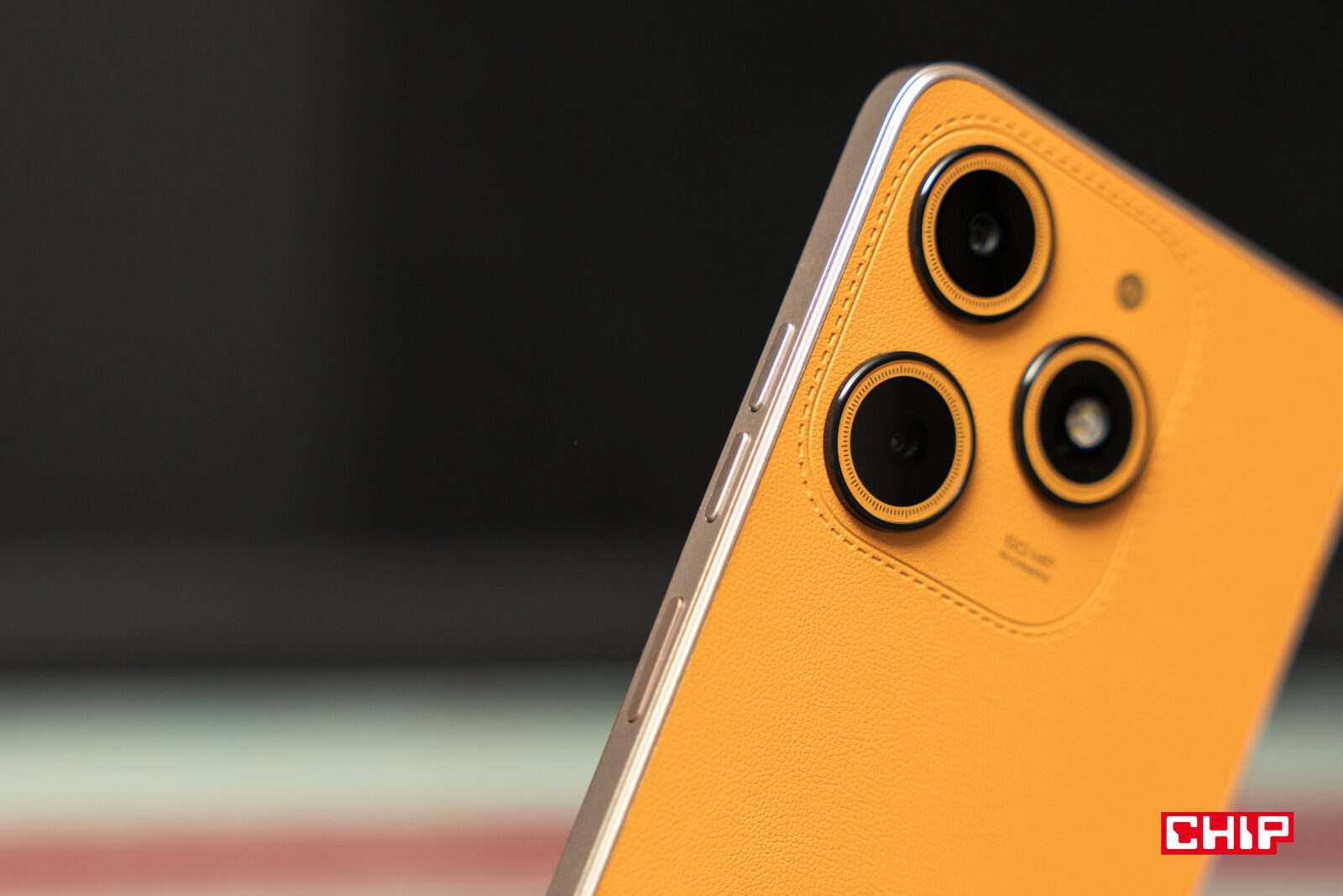 Konstrukcja urządzenia oczywiście nadal jest plastikowa. Jest to jednak plastik bardzo solidny; nic tu nie skrzypi, nie trzeszczy i całkiem zręcznie udaje aluminium. Tak samo, jak tworzywo na pleckach zręcznie udaje skórę. Pomarańczowa (lub żółta, zależnie od kąta padania światła) obudowa na żywo prezentuje się wspaniale, zarówno pod względem wizualnym, jak i haptycznym. Plecki są bardzo miłe w dotyku; wyraźnie czuć fakturę materiału, wyraźnie czuć frezowaną nazwę modelu i szwy dookoła wyspy aparatów.