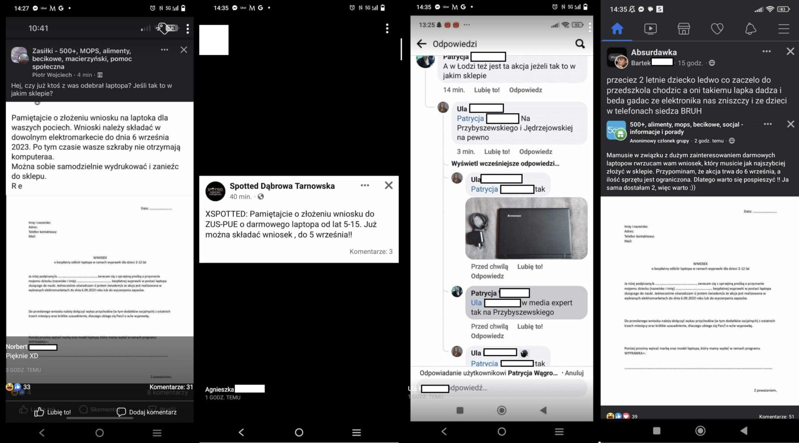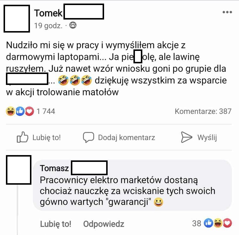 Kojarzycie te wszystkie grupy na Facebooku z darmowymi poradami prawnymi, sposobami na zasiłki, życie z 500+… Nie? Jak ja Wam zazdroszczę! Tak, są takie grupy, są bardzo popularne i są kopalnią humoru do czasu, kiedy uświadomicie sobie, że duża część osób pisze tam na poważnie! A nasza historia jest śmiertelnie poważna, bo nie chodzi o byle co, a o darmowego laptopa.