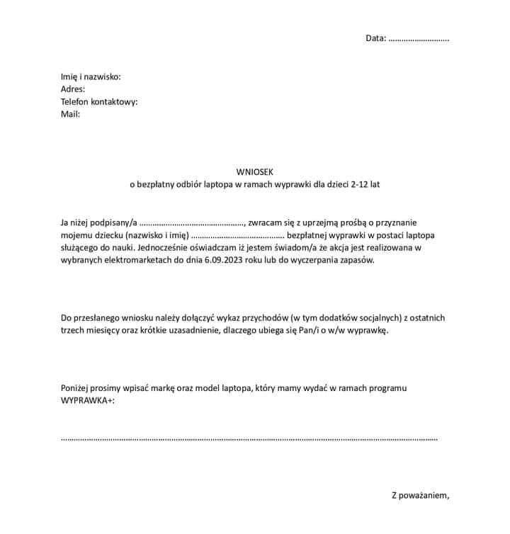 Jak go dostać? Wystarczy spełnić warunek, jakim jest posiadanie dziecka w wieku od 2 do 12 lat. Program Wyprawka+ trwa do 6 września 2023 roku lub wyczerpania zapasów i jest realizowany przez wybrane elektromarkety. Aby skorzystać z tego programu socjalnego, należy wypełnić specjalny wniosek, dołączyć do niego zaświadczenie o zarobkach oraz krótko umotywować swoją prośbę. Według mnie samo – należy mi się będzie wystarczające. Wzór pisma wgląda następująco: