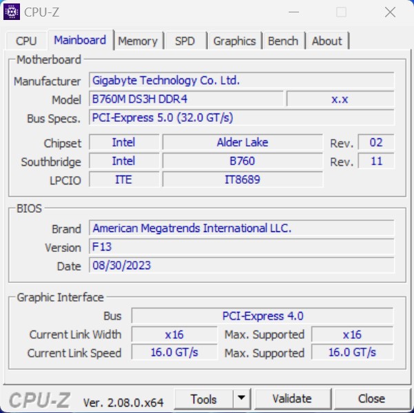 Całość została osadzona na płycie Gigabyte B760M DS3H DDR4. Konstrukcja nie ma WiFi i jest zgodna z pamięciami DDR4. Jest to podstawowa płyta, ale ponownie do tego procesora tak naprawdę nic mocniejszego nie jest potrzebne. Zastosowane pamięci to Kingston Fury Beast RGB 2x 8 GB 3600 MHz CL17. Co ciekawe zostały one ustawione na Gear 2, ale przy CR 1T. Pamięci również są dobrze dopasowane do zestawu i nie powinno być z nimi problemów.