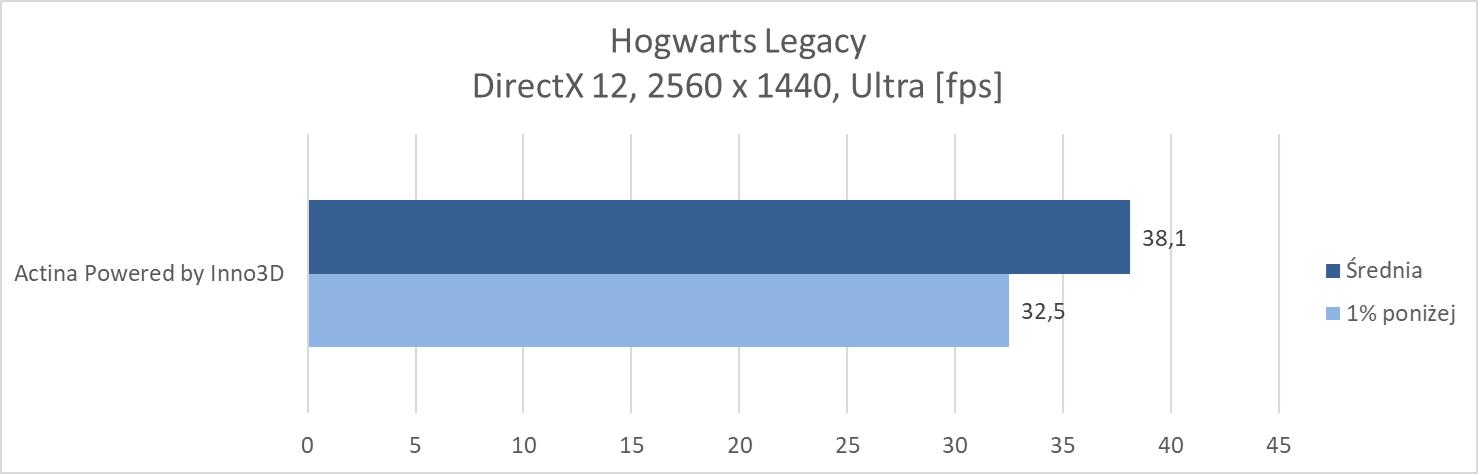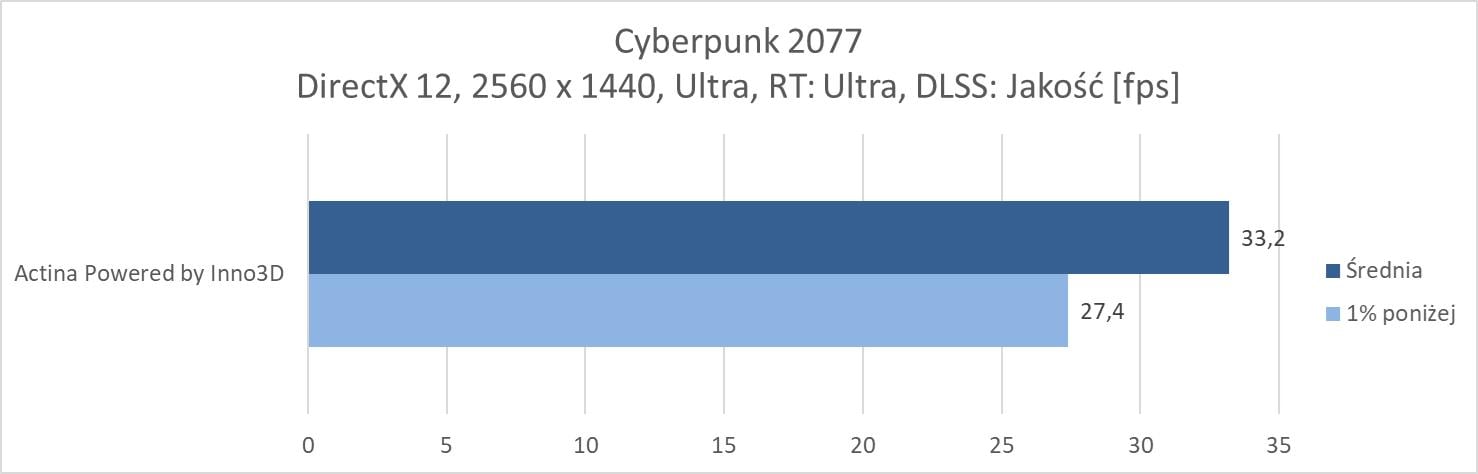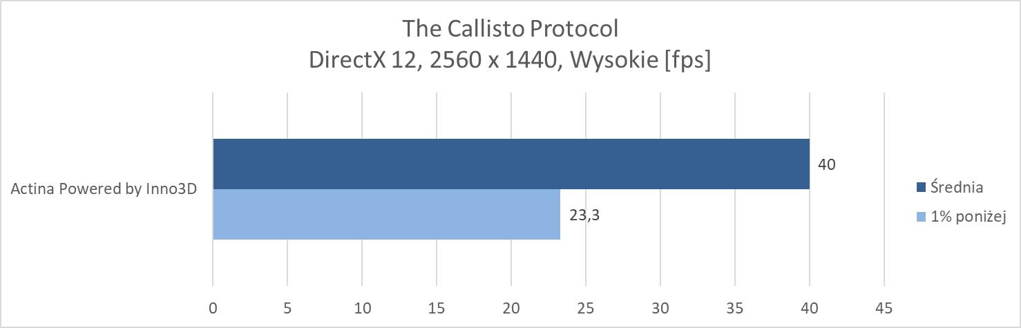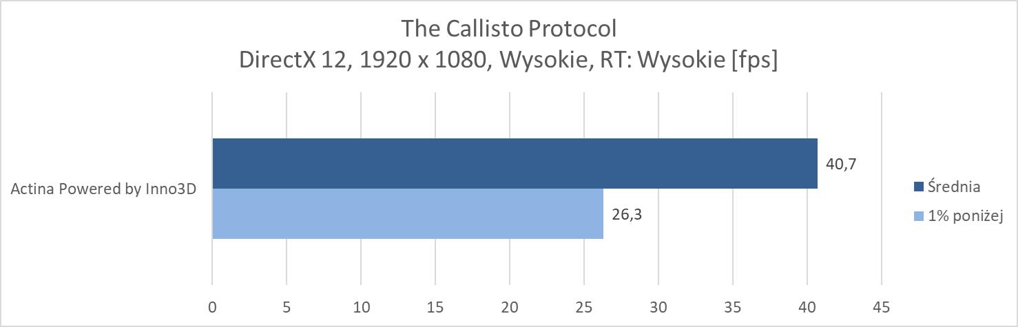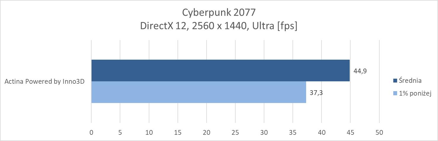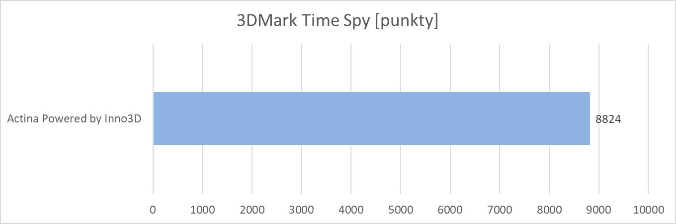 Temperatury wszystkich podzespołów są niskie i tutaj widać, że komponenty zostały dobrane tak, aby nie było z tym problemów. Actina Powered by Inno3D to również cicha konstrukcja, która podczas grania nie powinna kompletnie przeszkadzać, a w spoczynku być prawie niesłyszalna. Pobór mocy to kolejny plus – jest niski nawet w grze, dzięki czemu nie odczujecie zwiększenia rachunków za prąd.