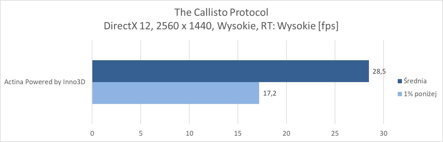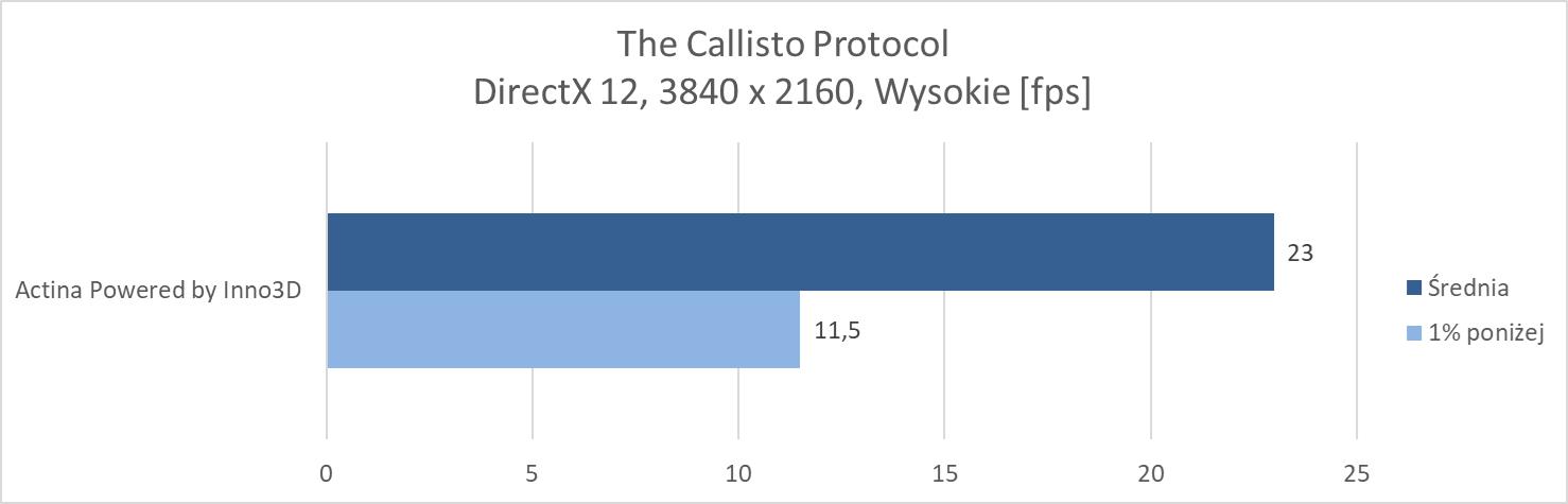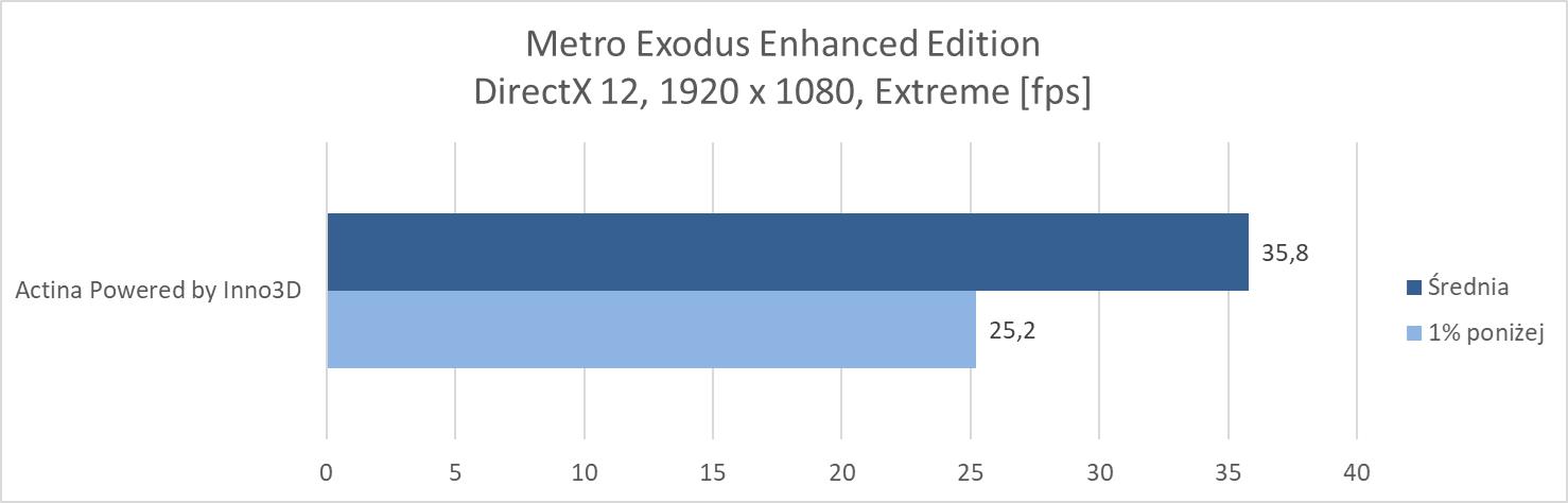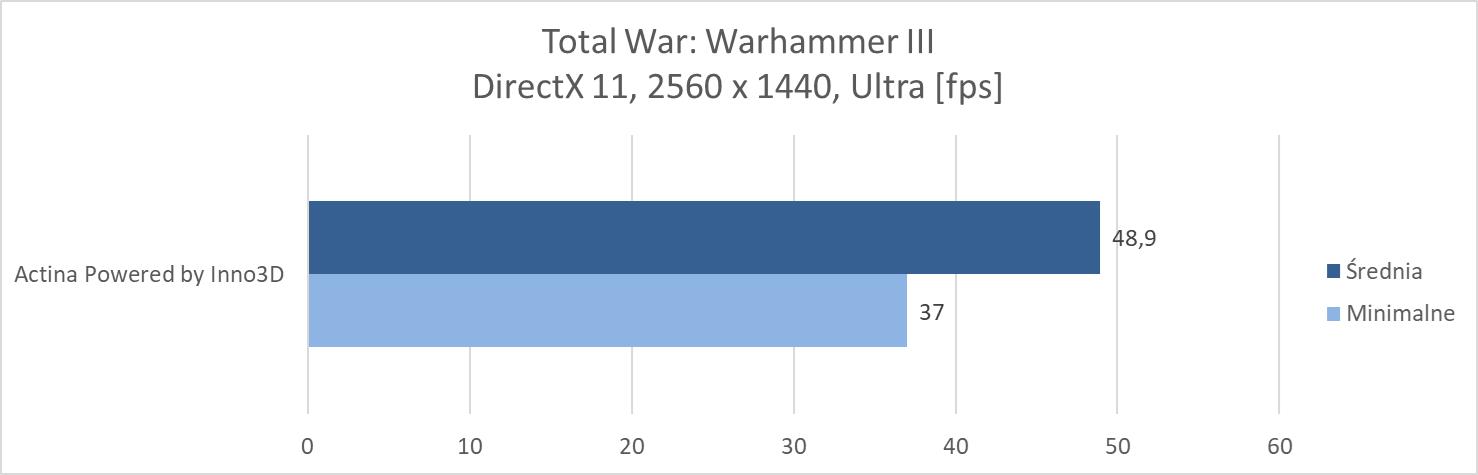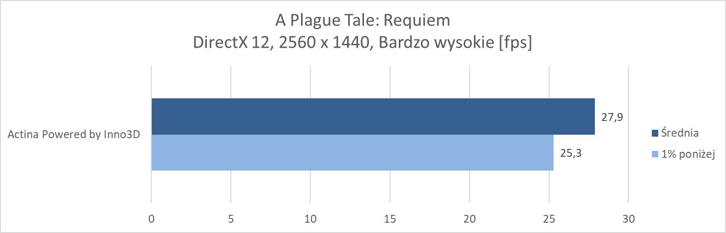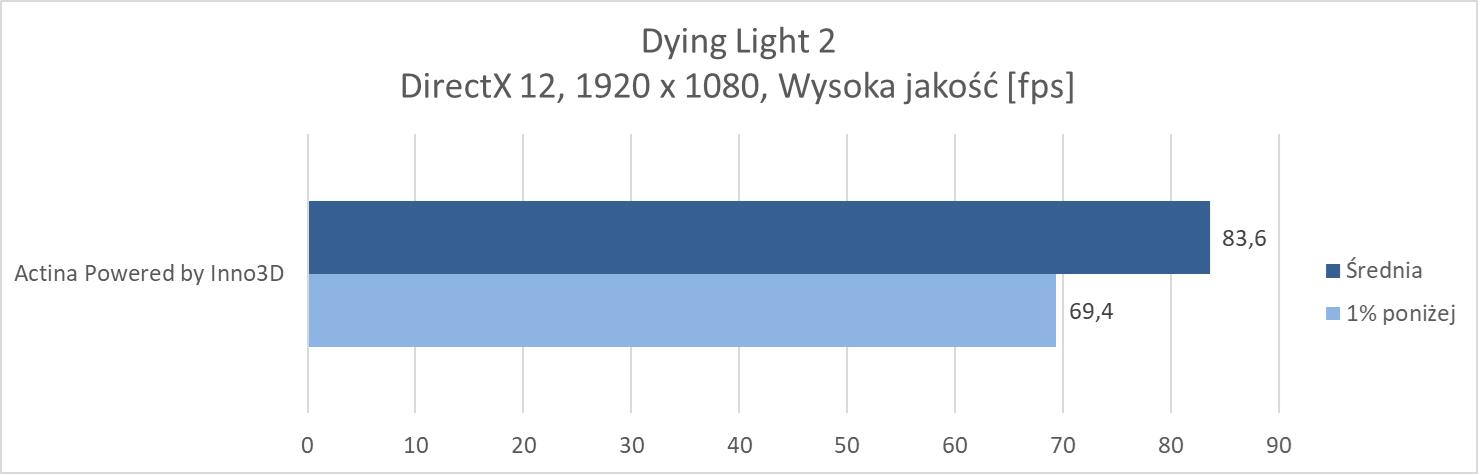 Temperatury wszystkich podzespołów są niskie i tutaj widać, że komponenty zostały dobrane tak, aby nie było z tym problemów. Actina Powered by Inno3D to również cicha konstrukcja, która podczas grania nie powinna kompletnie przeszkadzać, a w spoczynku być prawie niesłyszalna. Pobór mocy to kolejny plus – jest niski nawet w grze, dzięki czemu nie odczujecie zwiększenia rachunków za prąd.