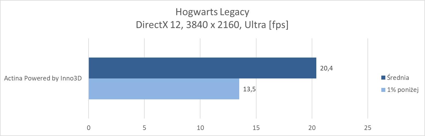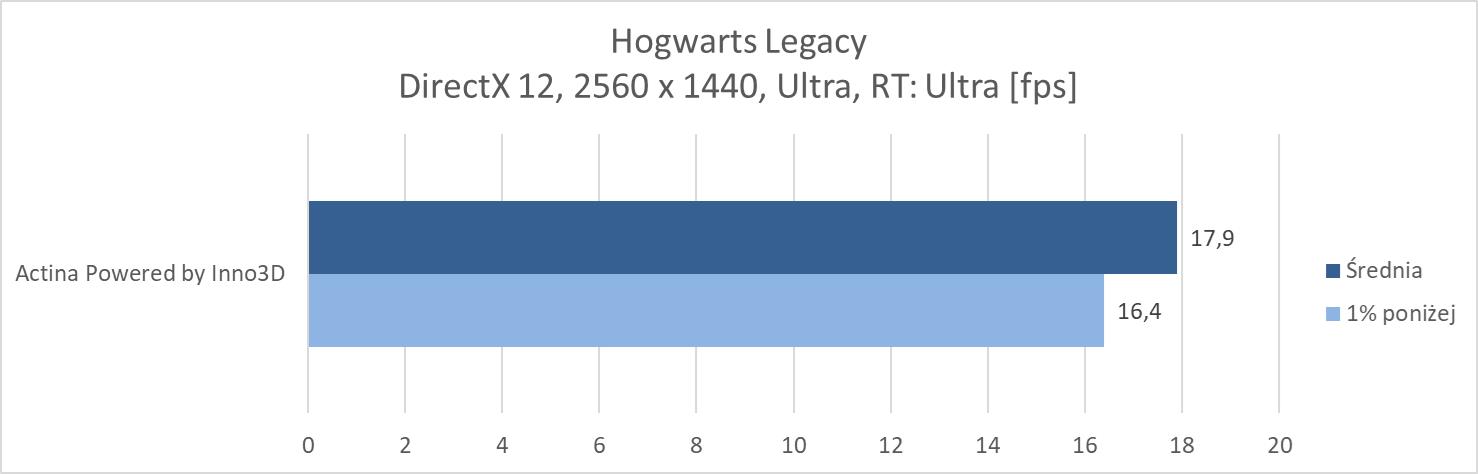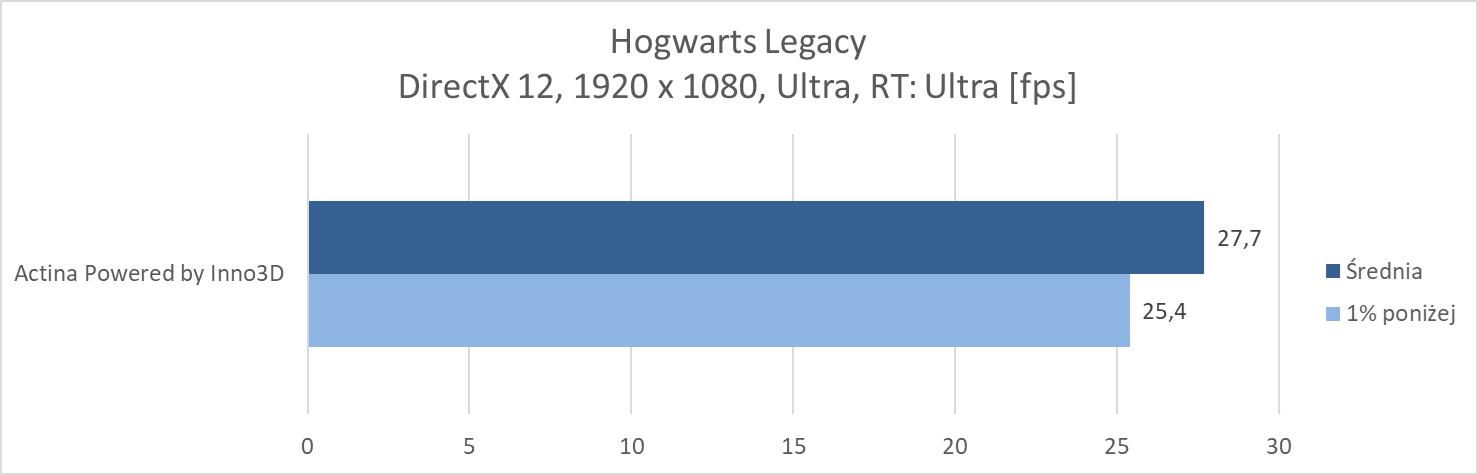 Po włączeniu śledzenia promieni zdecydowanie przyda się DLSS, aby uzyskać średnio 60 fps. Wyniki w 3 grach może nie są bardzo niskie, ale Hogwarts Legacy czy Cyberpunk 2077 są kompletnie niegrywalne.