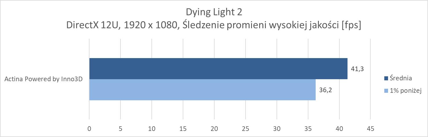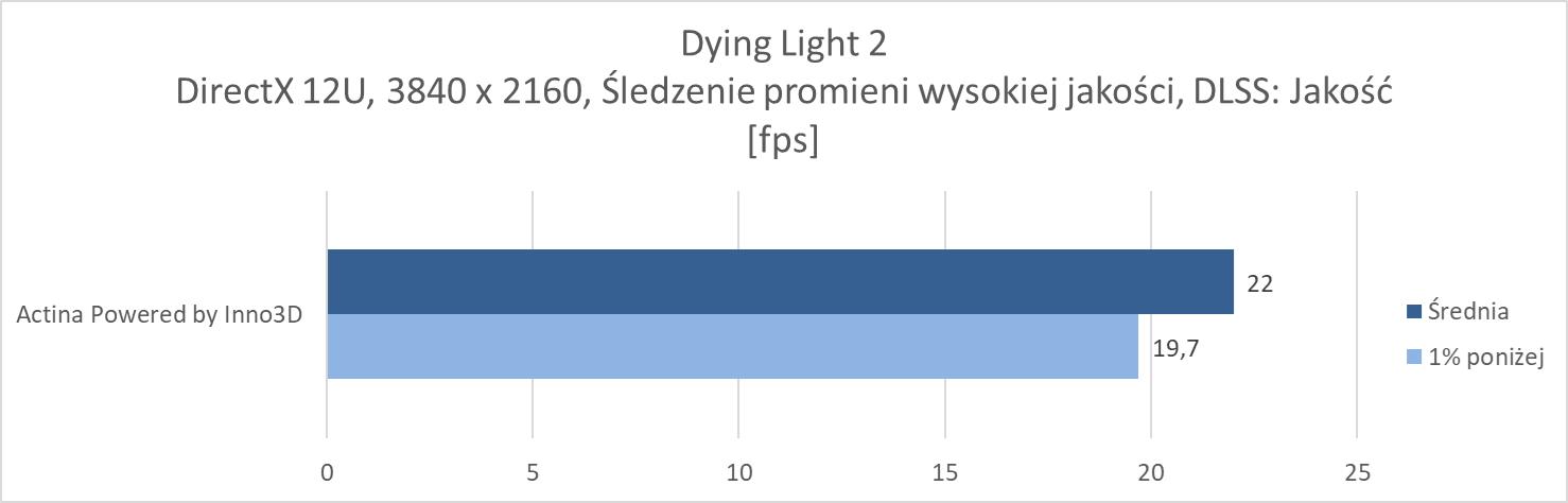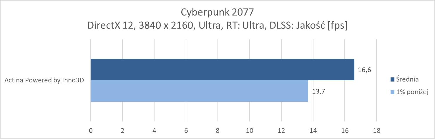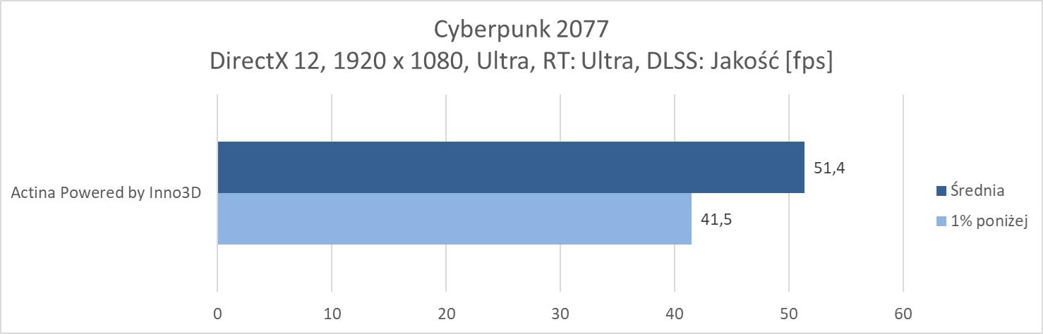 W ostatniej rozdzielczości wyniki są bardzo słabe i tutaj szkoda, że RTX 3060 nie obsługuje generatora klatek – ten zdecydowanie przy takich ekstremalnych, jak na ten zestaw warunkach, by się przydał,