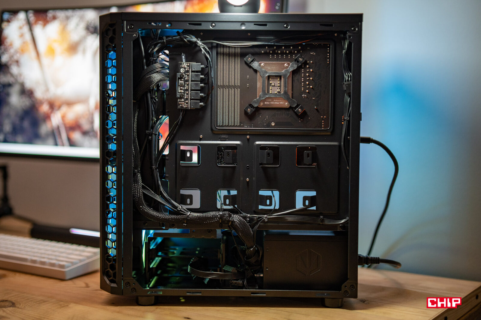 Jakość złożenia oceniam pozytywnie. Kable przeprowadzone są najkrótszą możliwą drogą, choć tutaj mam uwagę do PCI-E. Obudowa Endorfy ma otwór na spodzie, który pozwala na przeciągnięcie go znacznie krótszą drogą. Nie wiem czemu wielu producentów komputerów przeciąga go górą, co choćby częściowo zasłania pamięci RAM, która w tym przypadku ma podświetlenie. To akurat można zrobić lepiej i bardziej go ukryć – przynajmniej moim zdaniem wyglądało by to trochę lepiej. Z tyłu jest bardzo dobrze i wszystkie kable są odpowiednio pospinane i pochowane – tutaj nie ma do czego się przyczepić. Gdyby więc nie ta jedna rzecz to było by idealnie, ale mimo to jest nadal bardzo dobrze – znacznie lepiej niż przy wielu gotowych zestawach dostępnych do kupienia z sieci.