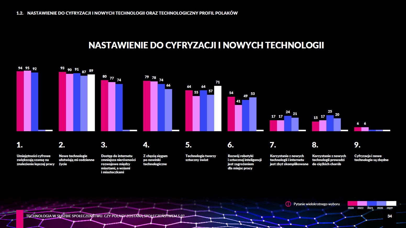 Słowem podsumowania, warto zwrócić uwagę na jeszcze jeden aspekt zawarty w raporcie. Badani zostali zapytani o strategiczne wyzwania, przed jakimi stoją dzisiaj Polacy. Jest ich tak dużo, że w zasadzie trudno jest się dziwić temu, że nie do końca zawracamy sobie głowy cyfryzacją. Zdaniem 90% badanych naszym największym problemem jest dzisiaj drożyzna. Tyle samo osób wskazuje starzejące się społeczeństwo i podziały polityczne, 89% zbyt dużą biurokrację, a 86% kolejki do lekarzy. Jeśli energię odnawialną zaliczymy do technologii, to była to dopiero 19. najpopularniejsza odpowiedź i 72% osób uważa, że w Polsce produkujemy zbyt mało zielonej energii. Dopiero na 21. miejscu mamy zbyt małe wsparcie rozwoju technologii, badań i innowacji. Ten problem wskazuje 71% badanych.