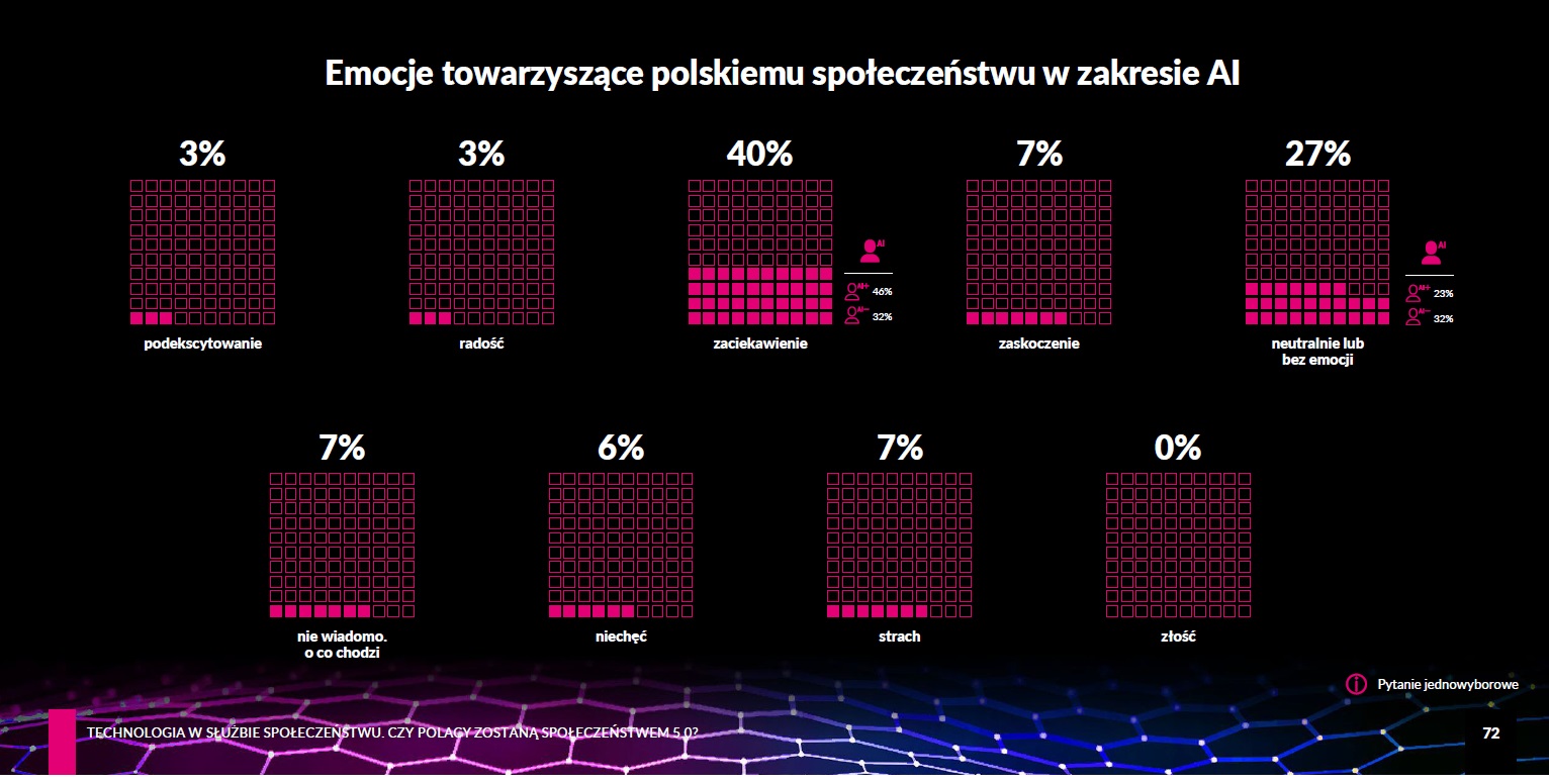 Sztuczna inteligencja nam na ogół nie przeszkadza. Toleruje ją 41% badanych, a 34% akceptuje. Do tego 7% pochwala, a 3% mocno popiera. Stanowczy sprzeciw wyraża 4% osób, a AI nie pochwala 11%. Dodajmy do tego, że sztuczna inteligencja nas ciekawi i to właśnie ciekawość wskazuje 40% badanych jako emocje towarzyszące temu zagadnieniu.