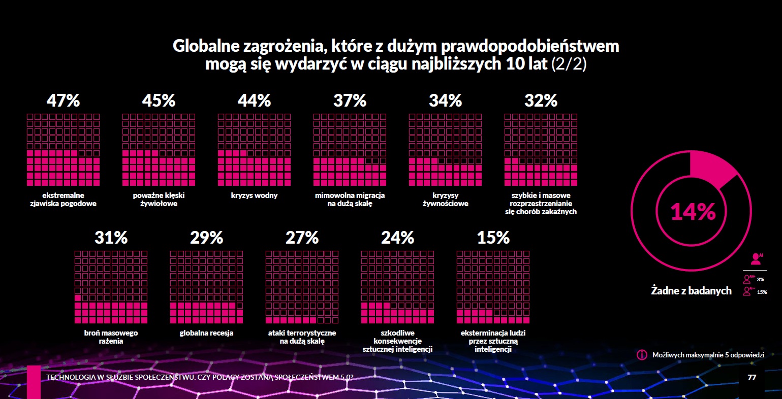 A jak to jest z tym Terminatorem – czy boimy się eksterminacji ludzkości przez sztuczną inteligencję? Takiego zdania jest 15% badanych i jeśli chodzi o globalne zagrożenia, dostrzegamy je w zupełnie innych miejscach.