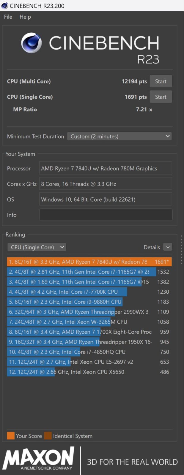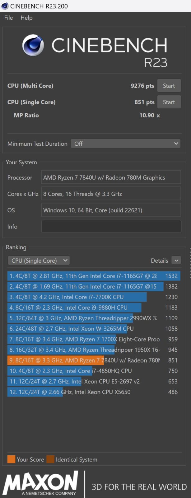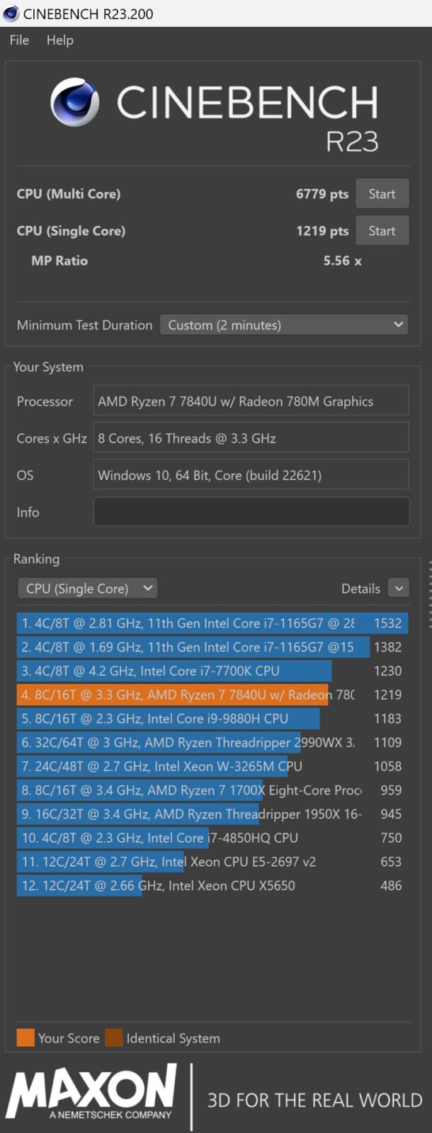 Nowy Ryzen nie rozwiązuje też niestety kluczowego problemu architektury x86, czyli spadku wydajności po odłączeniu od zasilania. Te wszystkie piękne wyniki w benchmarkach i hymny pochwalne dla płynności działania można między bajki włożyć, gdy tylko odłączymy laptop od prądu. Wyniki Cinebench R23 wyglądają wtedy tak (dodam też, że mimo ustawienia długości testu na 2 minuty, test single-core trwał… ponad 20 minut):