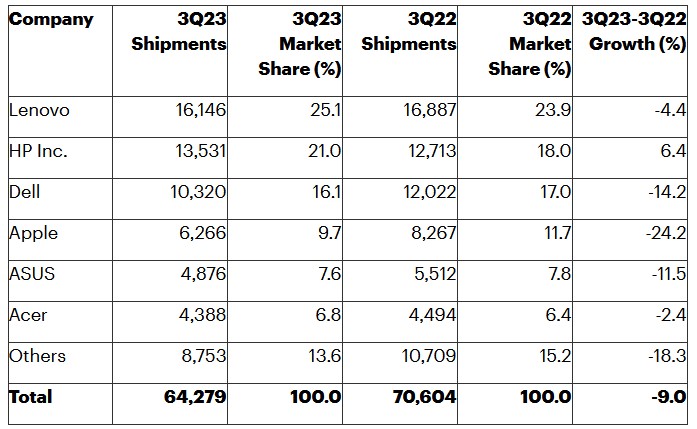 W czwartym kwartale bieżącego roku zyska tylko i wyłącznie HP. Producent ten ma odnotować wzrost (w skali rocznej) o 6,4% i dostarczyć na rynek ponad 13,5 mln urządzeń. Inni odnotują zmniejszenie sprzedaż w różnym stopniu. Najmniej Acer (-2,4%), a najwięcej właśnie Apple. Firma z Cupertino w ostatnim kwartale 2022 roku dostarczyła klientom 8, 267 mln urządzeń, jednak w tym roku będzie to zaledwie 6,266 mln. Spadek wynosi aż 24,2%.